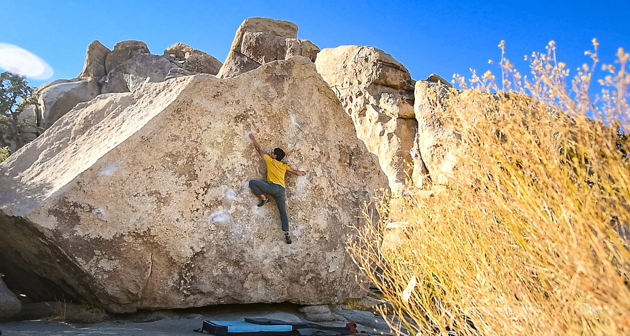 차갑고 상쾌한 이른 아침 공기 사이로 파고드는 햇빛은 벌써부터 강렬하고 뜨거워 내가 바삭바삭해지는 기분이 들었다. 주차용 갓길에 첫 번째로 차를 대고, 예쁜 노란 사막의 빛과 대비되는 새파란 하늘, 그리고 언제 봐도 신기하게 생긴 조슈아 트리들 사이를 걸어 JBMFP 바위에 도착했다. 조용하고 시원하며, 따뜻하고, 편안했다. 나갔다 오라고 등을 밀어준 아내에게 고마웠다.