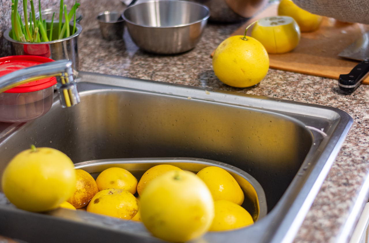 아내는 포멜로의 일부분을 청으로 담가 두었다.
