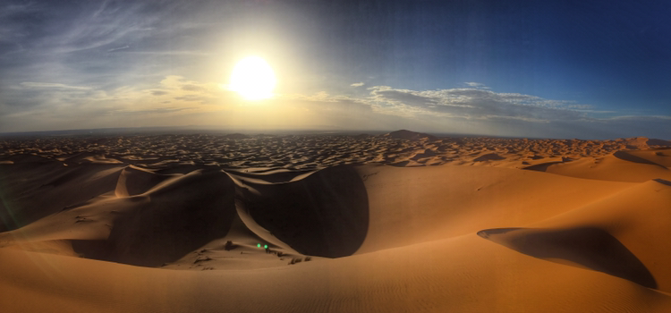 해 질 녘 사막 언덕의 꼭대기에서 바라보는 사하라의 모습은