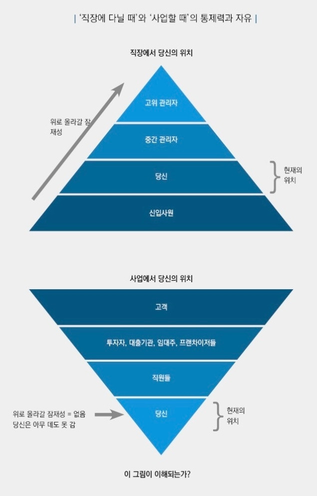 혹시 남의 밑에서 일하는 게 맞지 않아서 사업을 생각하고 있는가? 사장은 맨 위가 아니라 맨 밑에 있는 입장이다. 돈을 많이 벌고 싶어서 사업을 하고 싶은가? 정작 시급으로 치면 직장인이 더 높을 수 있다. 주말과 퇴근이라는 개념 없이 자기만의 일을 책임질 각오가 있는지 진지하게 자문해봐야 한다.