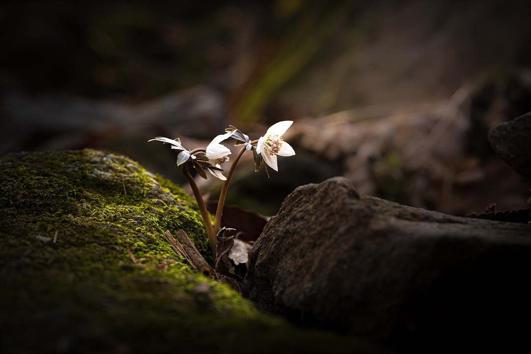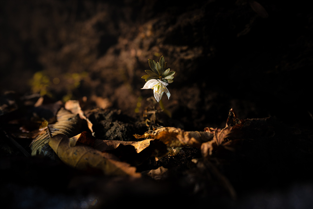 봄바람이 계곡을 타고 아래에서 위로 올라와 산 깊숙한 곳으로 파고들었다. 얼었던 땅이 봄바람에 녹으며 물이 돌고, 단단하게 얽혀 있던 땅의 결기가 잠시 헐거워진 틈을 비집고 너도바람꽃이 멋지게 꽃을 피웠다. 수줍은 듯 고개를 숙이고 있지만, 겨울의 언 땅을 뚫고 꽃대를 곧추세우는 강인한 아이다. 이 아이가 가진 꽃말이 '사랑의 비밀', '사랑의 괴로움'인데, 혹독한 추위 속에서 인내하며 남몰래 피어나는 속성을 잘 표현한 말인 것 같다.