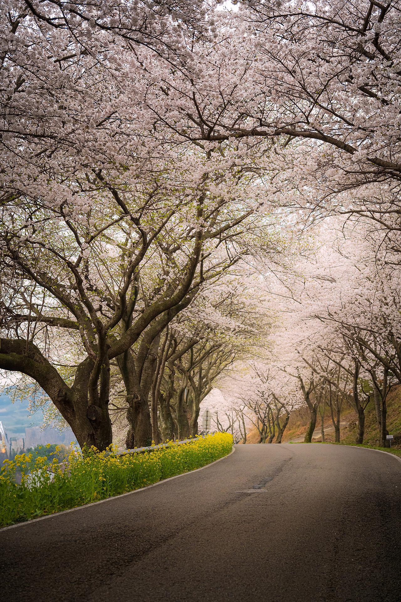 남해에 들어서서 처음으로 찾은 곳은 왕지벚꽃길이었다. 5 Km 남짓한 구간에 1,170여 그루의 왕벚나무가 해안선을 따라 벚꽃터널을 이루고 있었는데, 노란 유채꽃과 분홍빛 벚꽃이 옥빛 바다와 어우러져 감탄을 자아냈다.