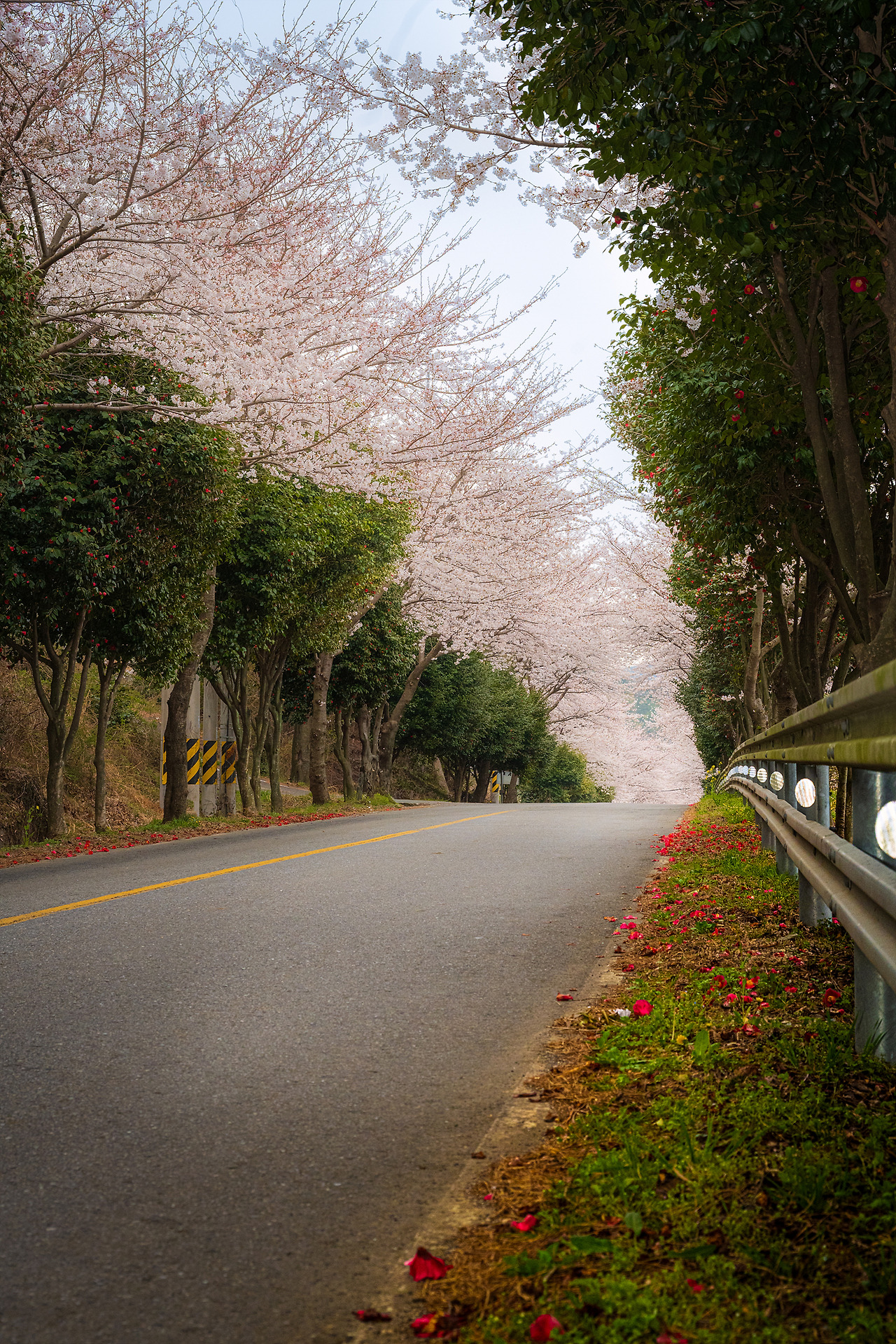 왕지벚꽃길을 천천히 감상한 후, 남해읍을 지나 서면사무소를 거쳐 1024번 지방도를 타고 작장리로 들어서자, 길가에 이색적인 풍경이 펼쳐졌다. 동백의 붉은 꽃송이가 융단처럼 깔린 길 위로 화사한 벚꽃이 만개했다.