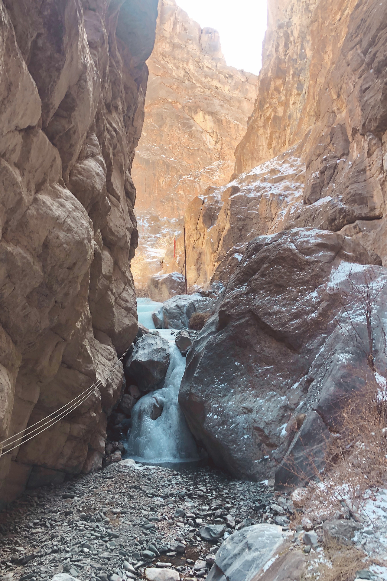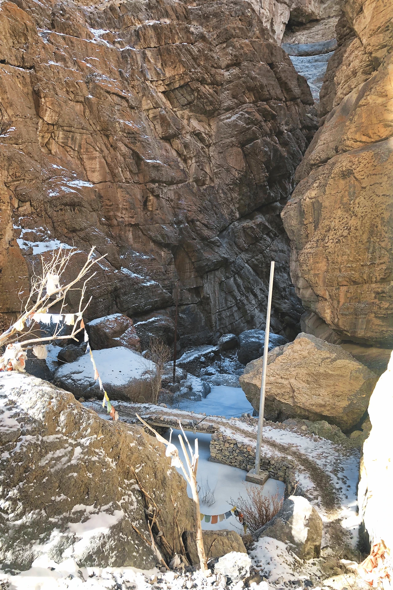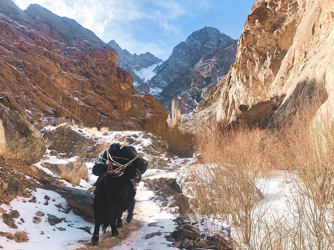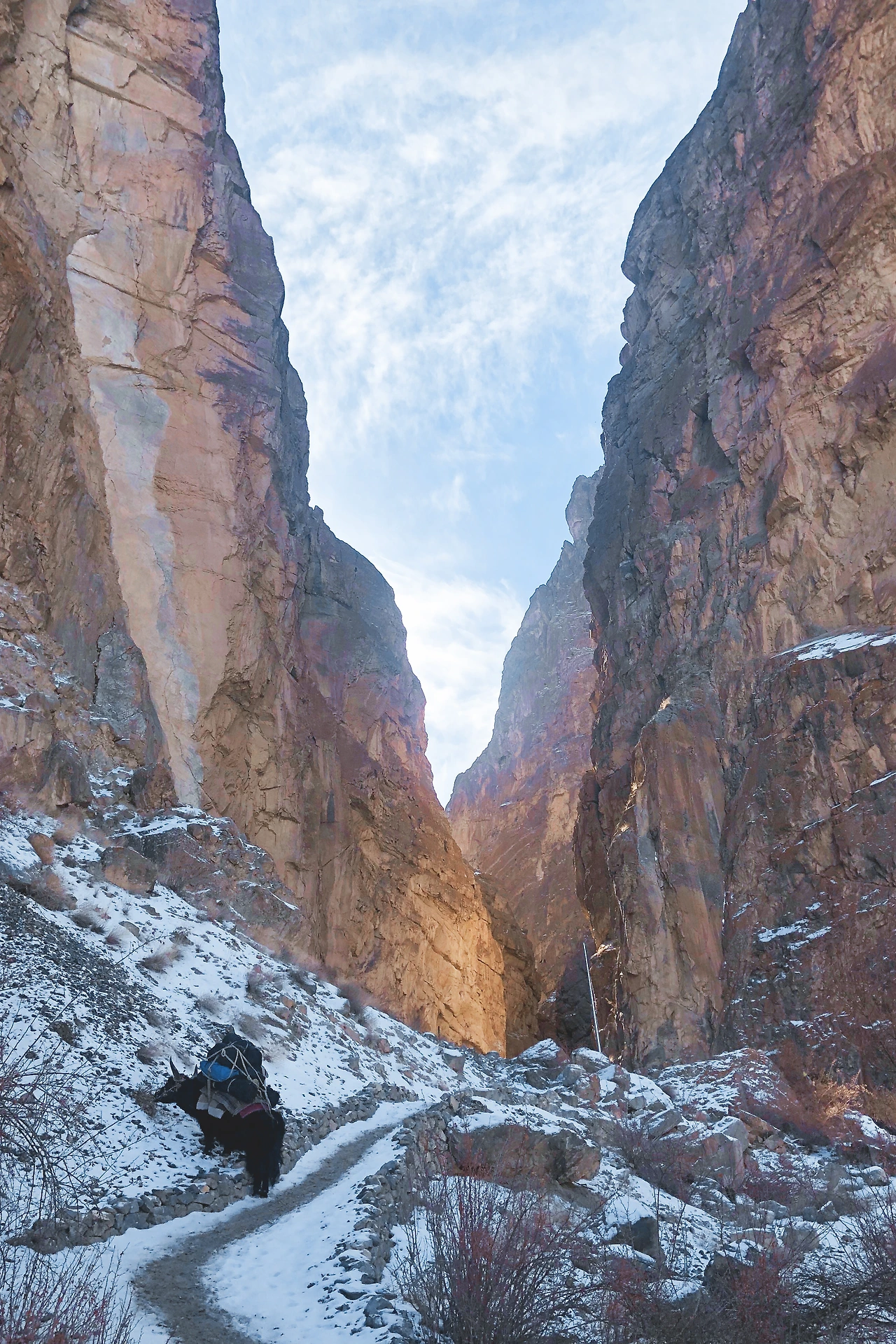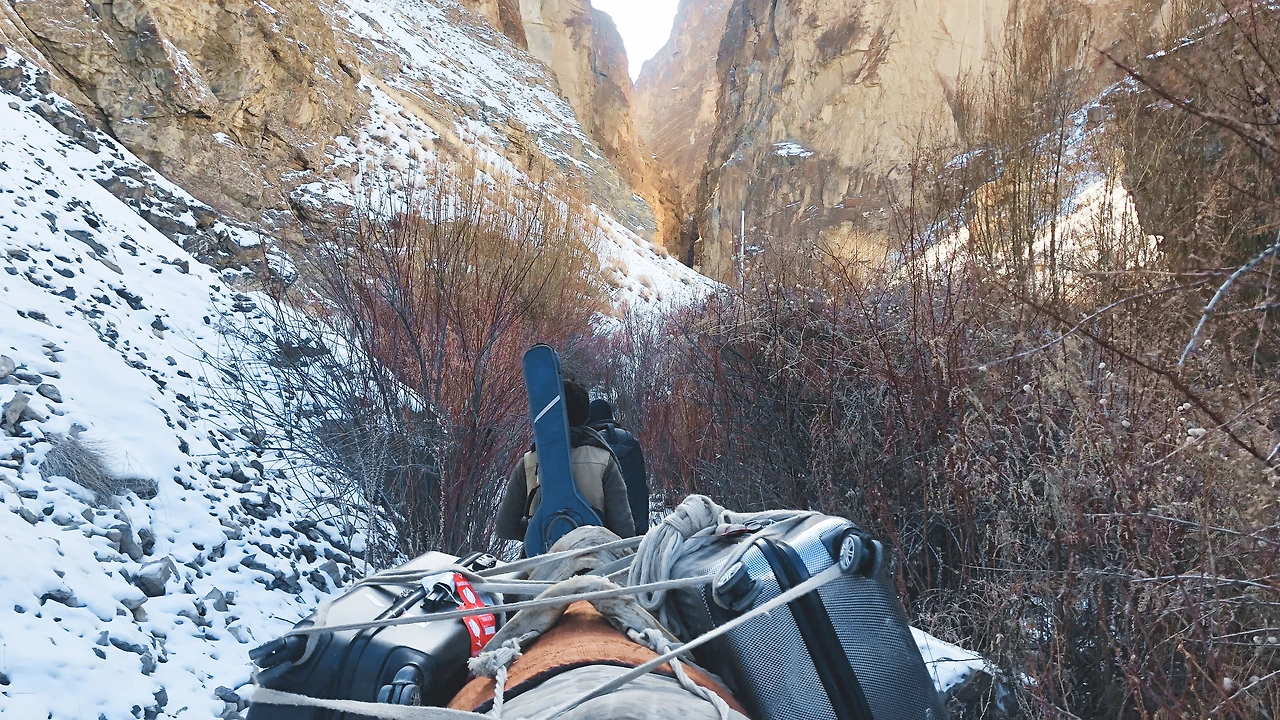 가볍게 걸으면 한 시간 정도 걸린다는 길은 우리 촬영팀의 개인 짐과 촬영장비, 식품과 비품 등을 모두 실은 소 두 마리와 함께 걸으니 두 시간 반 정도 걸렸던 것 같다. 특히 협곡은 길이 좁고 얼음으로 길이 얼어있는 구간이 심했다. 꾸불꾸불 오르락내리락 걸어가야 했다. 이럴 땐 별생각 없이 그저 걷는 것밖엔 할 수 있는게 없다.