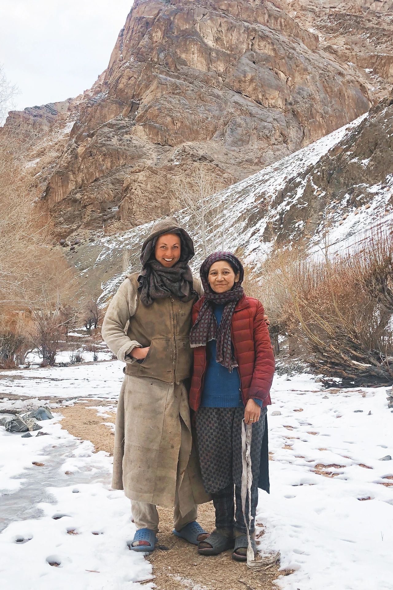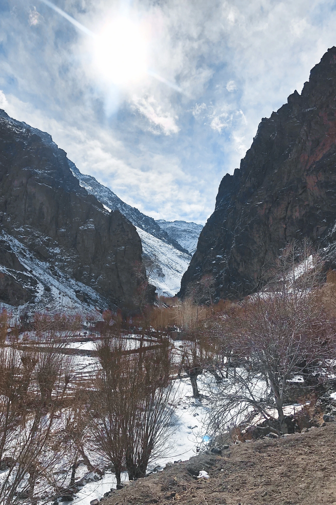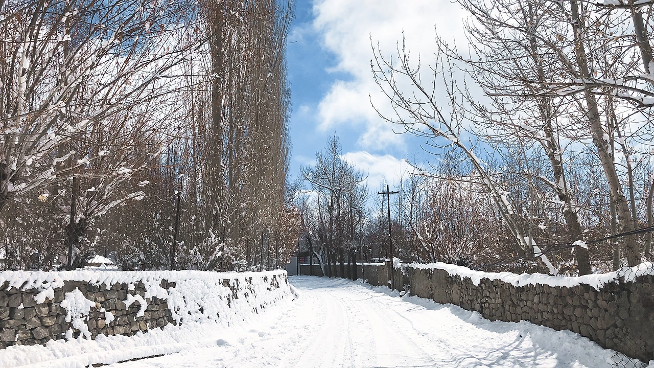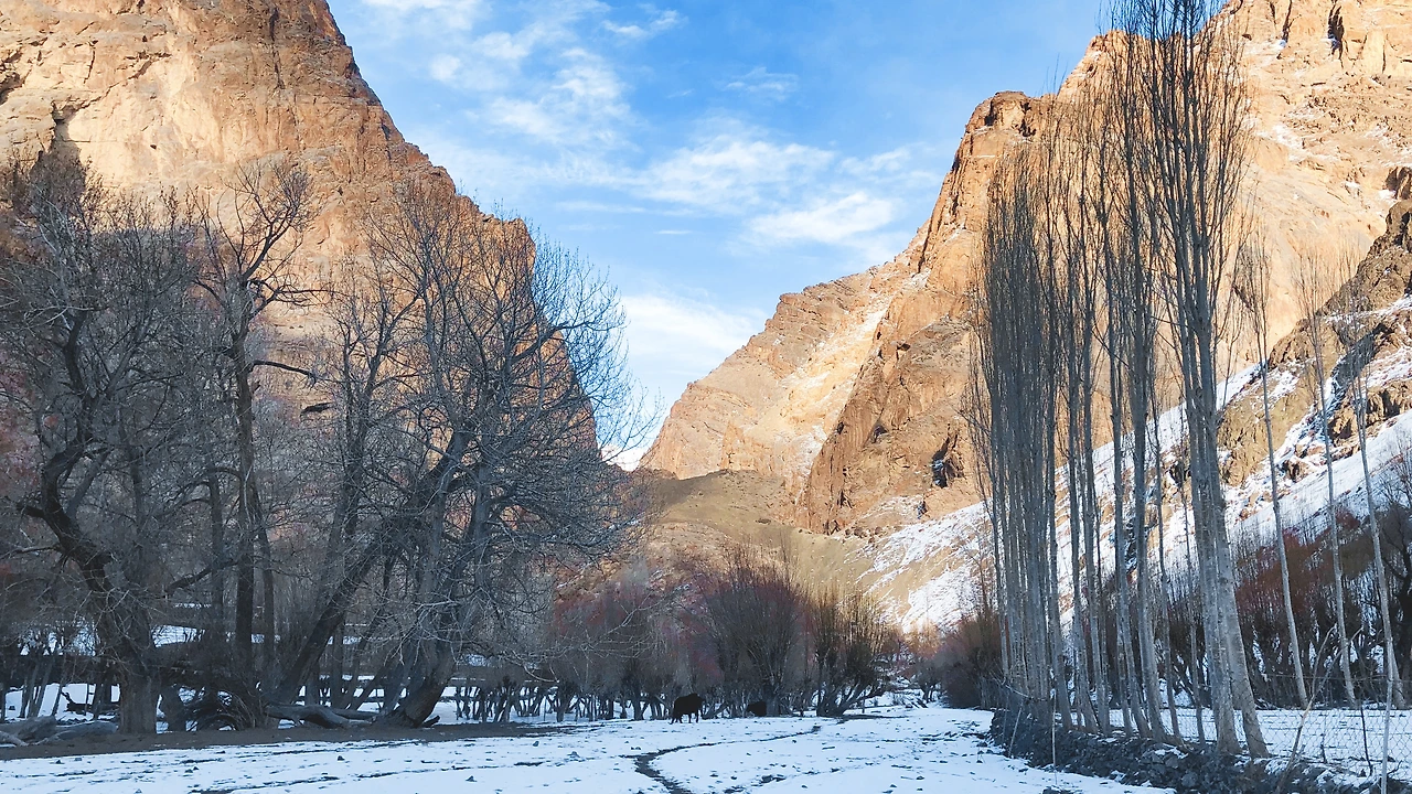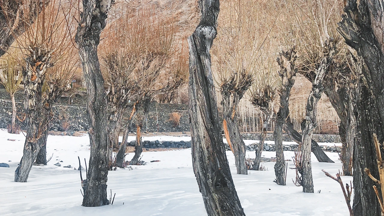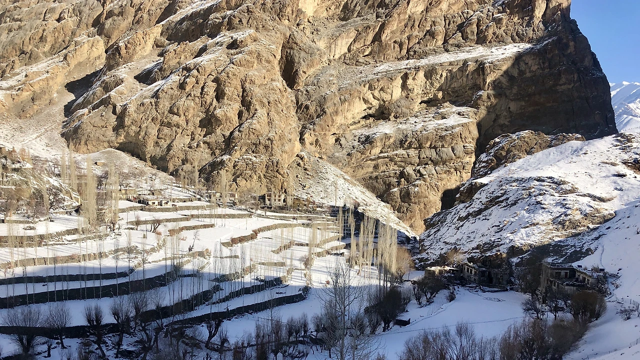 드디어 마을이다. 아니, 드디어는 내가 붙인 말이다. 마을 초입부터 얼음 빙판을 조심하라고 했다. 왜인지 나무들이 얼음 안에 있었다. 아마 여긴 시냇물이 흐르나 보다. 이 마을의 여름날 시냇물 소리, 살구나무에 열린 살구들, 풍성한 밭, 양 떼가 양치기를 따라 산을 오르는 풍경이 머릿속에 그려진다. 이 마을의 봄 여름 가을과 겨울의 모습은 과연 어떨까?