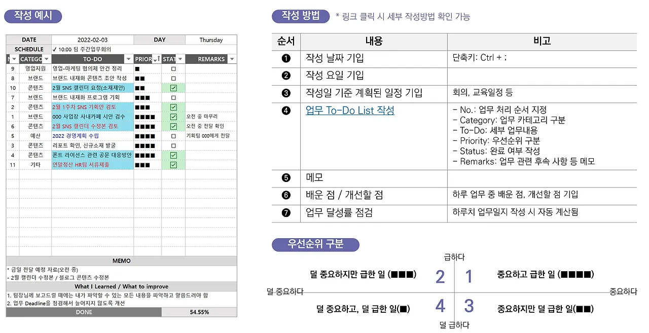 - 해당 업무일지는 처음 제작한 버전이라, 개인적으로 일부 아쉬운 점이 있습니다. 아래 글로 전반적인 업무일지의 구성과 사용법에 대해 확인하시고, 글의 말미에 소개되어 있는 ver.2를 사용하시는 것을 추천드립니다. (기본적인 구성과 사용법은 동일하며, 초안의 아쉬운 점을 보완한 버전입니다.)