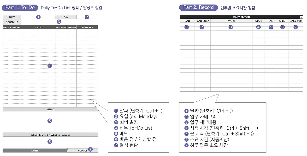이 업무일지는 두 가지 파트로 구성되어 있습니다.