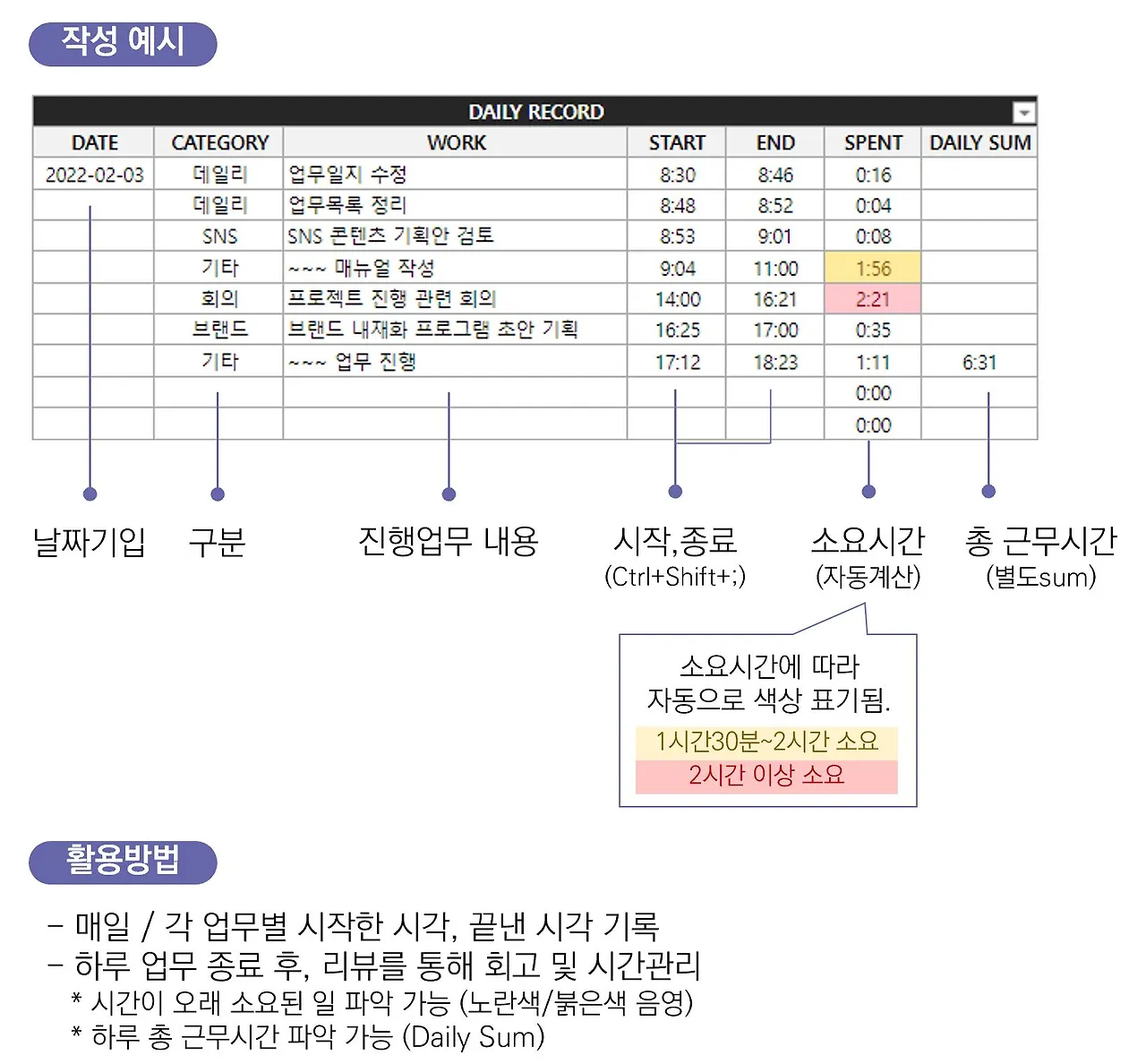 - 오래 걸리는 일을 색출하기 위한 양식이기 때문에, 소요시간에 따라 자동으로 색상이 표기됩니다.