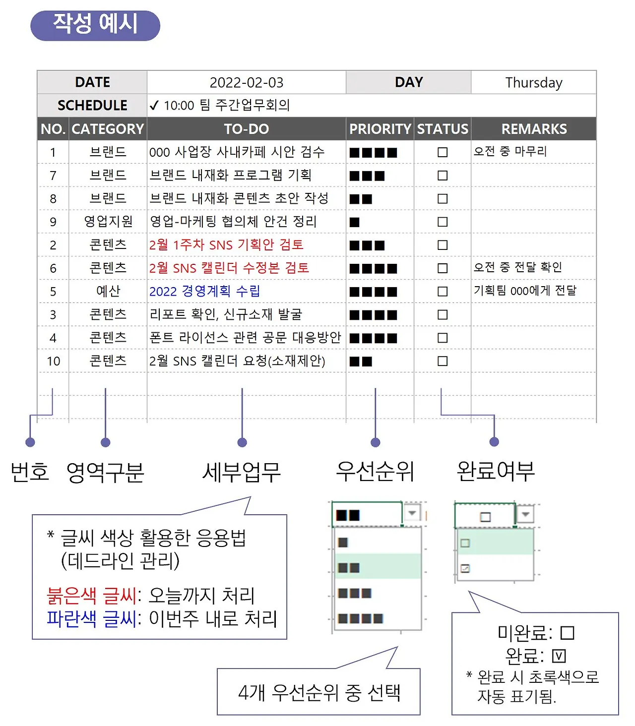 - 해당 업무를 미완료했을 경우 □로, 완료했을 경우 체크박스를 입력해주세요.