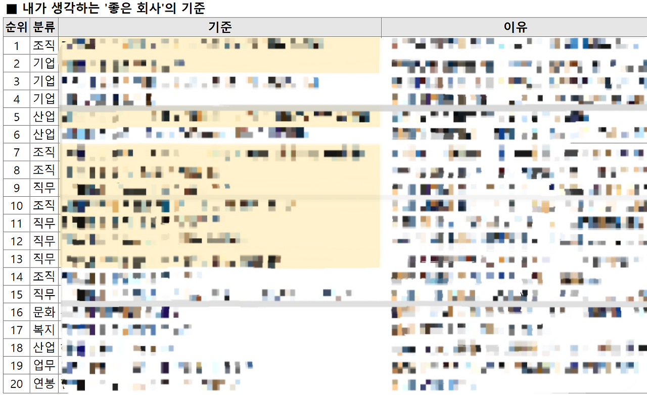 그리고 기존 직장을 다니며 아쉽다고 생각했던 점도 함께 생각해보며 구체적인 기준을 적어보았습니다.