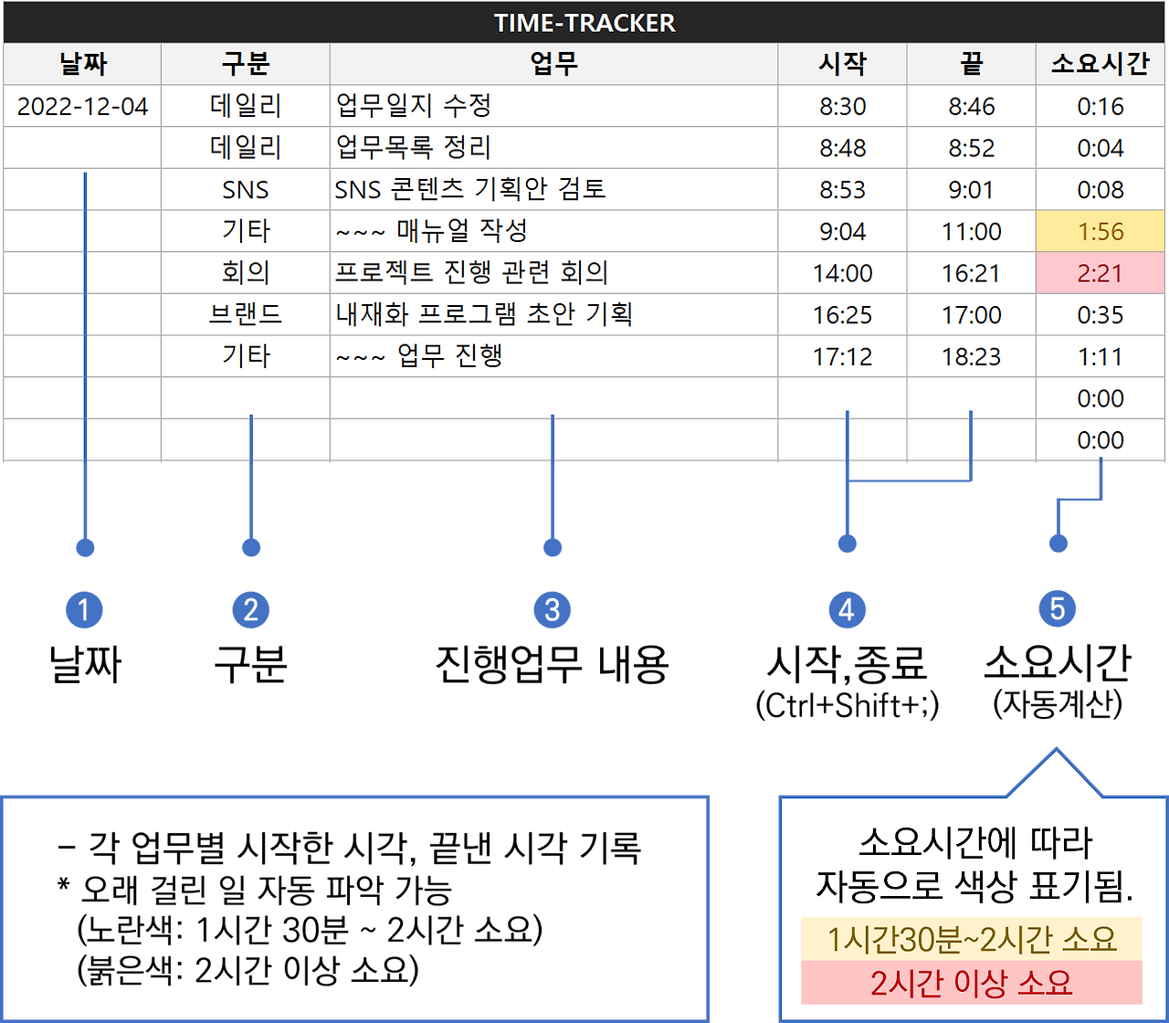 ④ 시작, 끝: 업무를 시작한 시각 & 끝낸 시각 적기 (단축키: Ctrl + Shift + ;)
