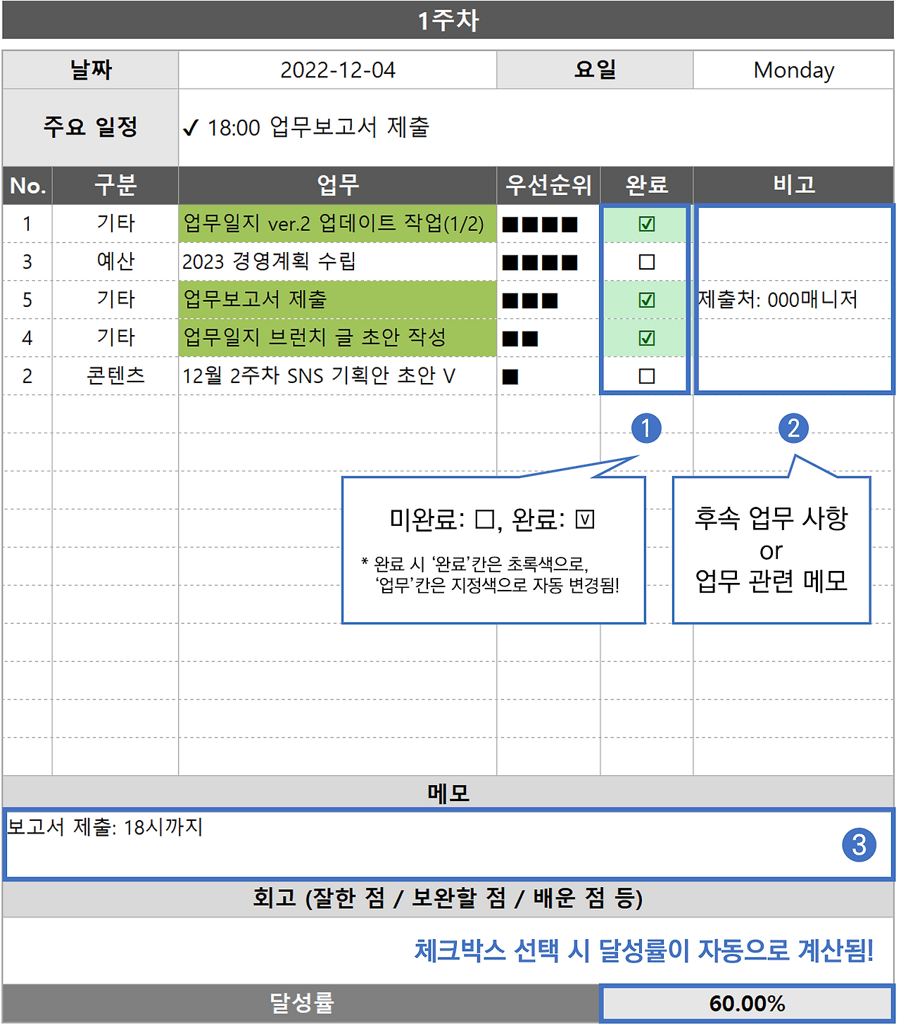 * 체크박스 입력 시, 하단에 업무 달성률(%)이 자동으로 계산됩니다.