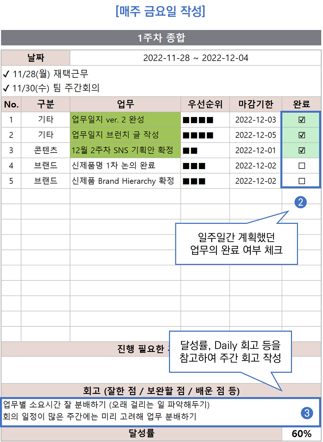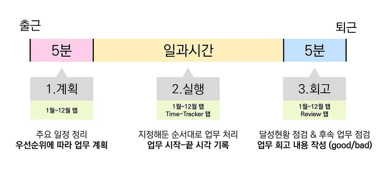 - 3단계 <회고>: 달성현황 점검 & 후속 업무 점검, 업무 회고 내용 작성 (퇴근 전 5분)