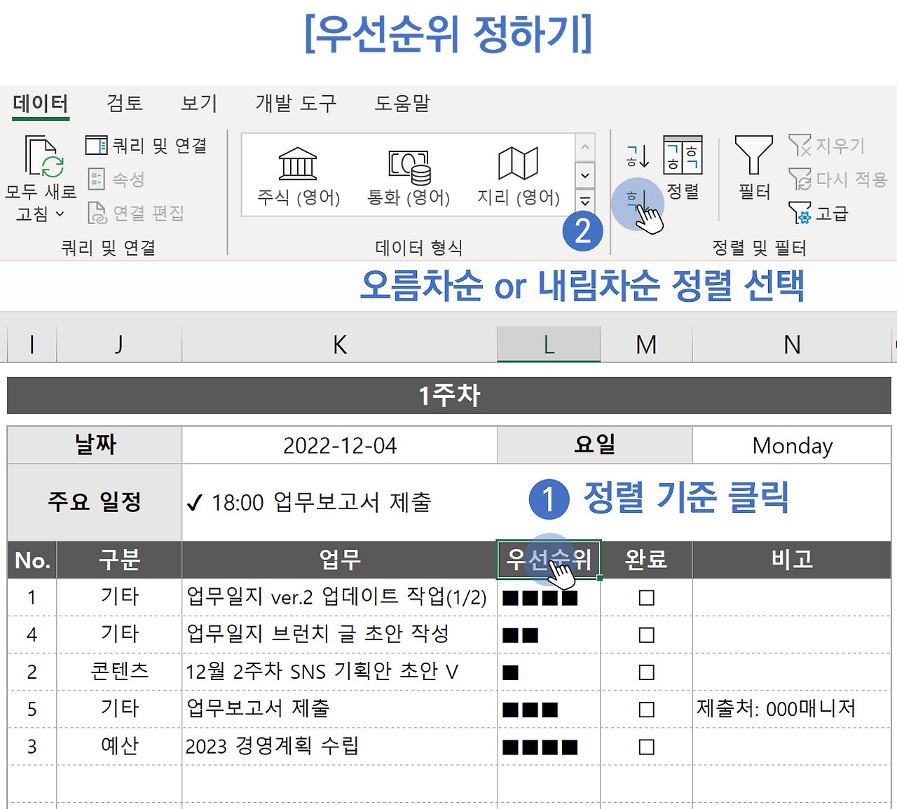 + 정렬 기능을 통해 업무 순서 정하기 ★ (우선순위 기준: 내림차순 정렬 / No. 기준: 오름차순 정렬 활용)