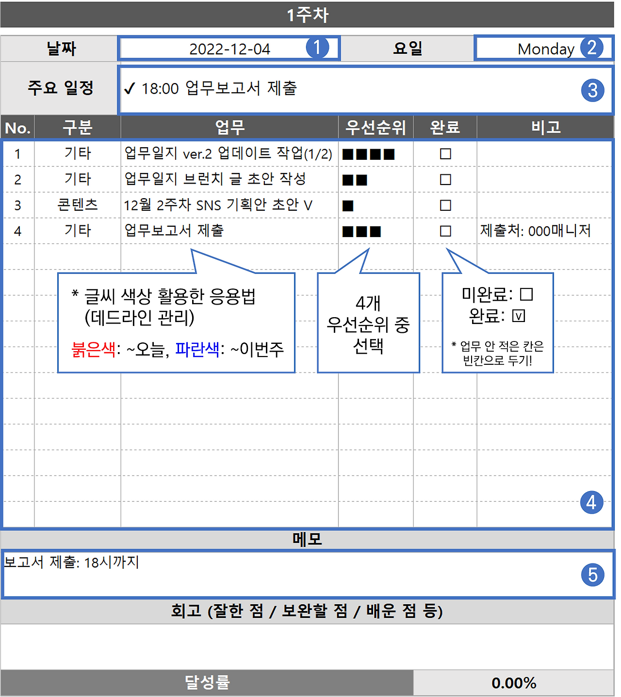 - 작성방법: 아래를 참고해 ① ~ ⑤번 칸을 순서대로 채우기 → 우선순위별 업무순서 정하기