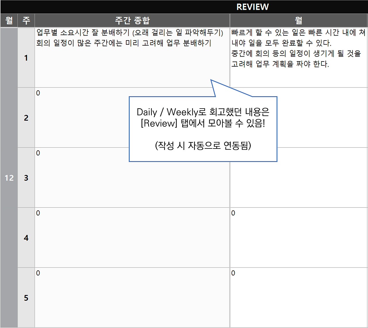 * Daily, Weekly 회고를 적어주시면 [Review] 탭에 자동으로 해당 내용이 연동됩니다. (신기능!)