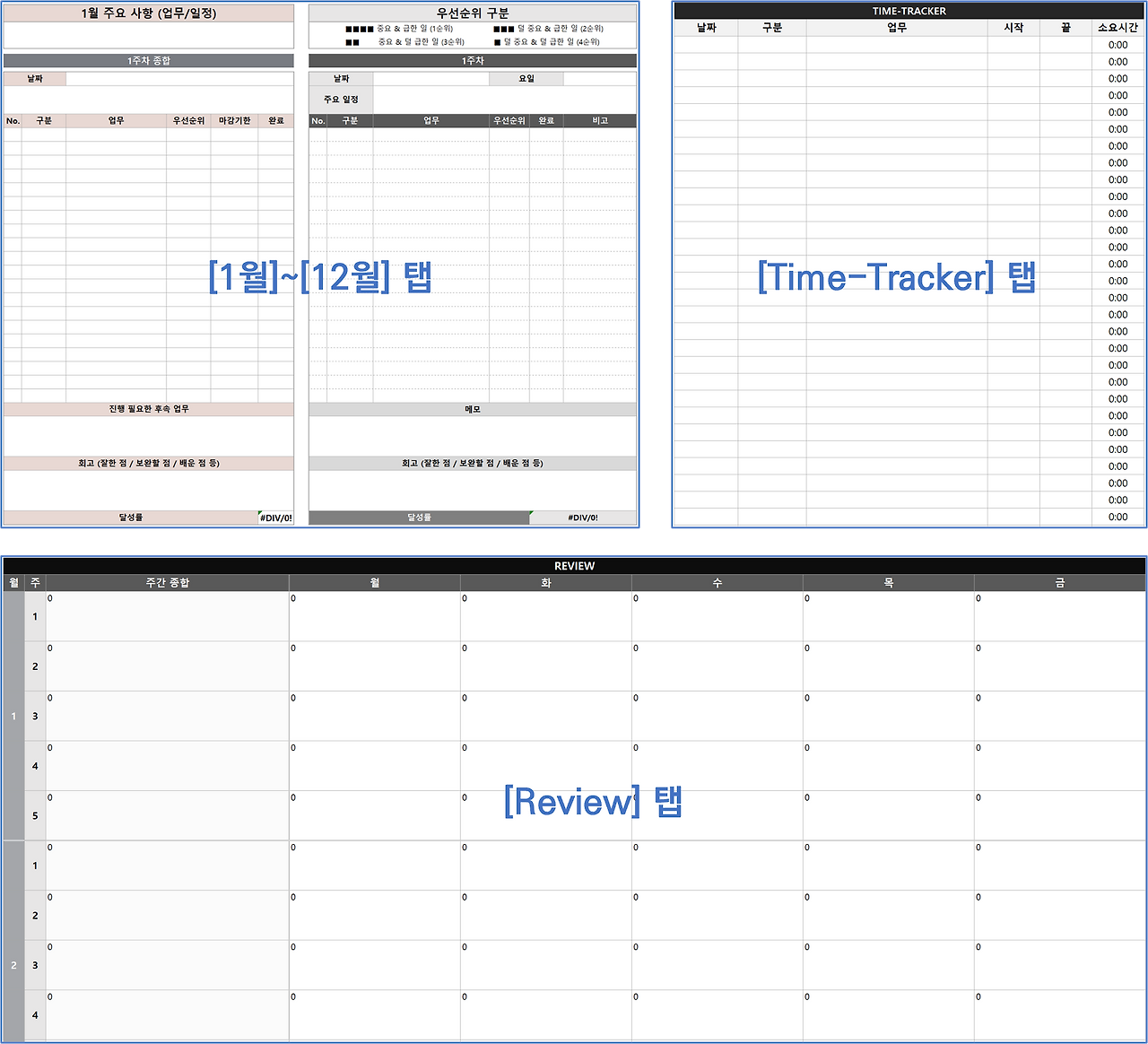 - 작성영역: [1월]~[12월] 탭 + [Time-Tracker] 탭