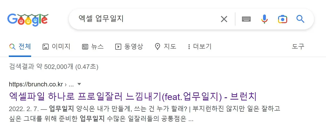 주기적으로 울리는 브런치 알람을 보며 어서 다음 글을 써야겠다고 생각하던 중, 다소 충격적인 사실을 알게 되었습니다. 바로 구글에 '엑셀 업무일지'를 검색했을 때 제 글이 최상단에 노출된다는 것이었는데요.