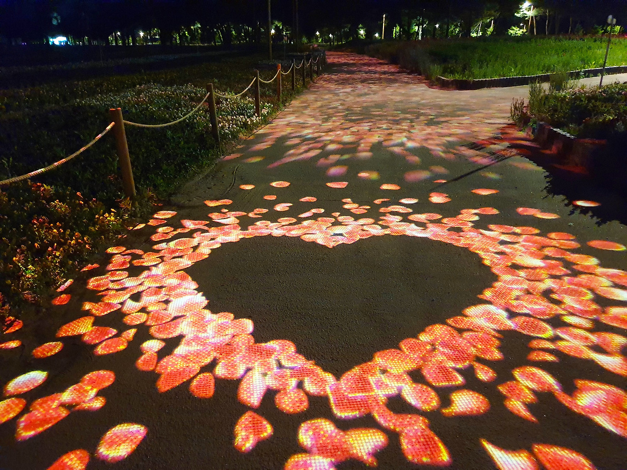 파란빛을 잃고 까만 밤하늘이 되면 빛은 새롭게 변신한다. 순간 가로등이 꺼지는가 싶더니 발아래가 환해진다. 그런가 하면 소나무 숲 아래는 빛의 속도로 번득이는 불빛이 연신 무엇인가 형체를 만들어낸다. 움직임이나 사진 형태로 발아래를 화려하게 장식한 건 조명 필름에 문구나 글씨를 붙여서 바닥이나 벽면에 비추는 고보조명이었다. 건물이나 물체 같은 곳 표면에 영상을 투사해 실제로 존재하는 것 같은 가상 영상을 만들어내는 음향시설 프로젝션 매핑은 소나무 아래였음을 눈치챘다. 이 밖에 레이저 조명 투광등 보안등 등의 다양한 경관시설로 빛의 신비가 펼쳐진다.