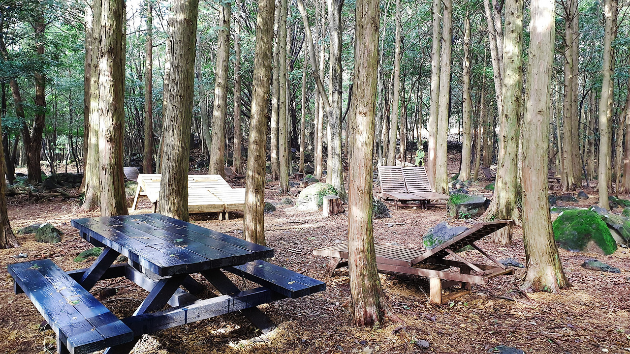 숲으로 들어서자 비가 그치고 햇살이 쏟아지더니 잠시 파란 하늘도 보여준다. 시시각각 변하는 날씨만큼 다양한 숲의 얼굴을 만난다. 얼마나 오랜 세월 그곳에서 사람들을 품어주었을까. 커다란 나무에 안겨도 보고 이야기도 걸어본다. 쭉쭉 뻗은 편백숲 삼나무숲에 감탄하고 안으로 들어설수록 숲의 신비에 빠져든다. 제2 쉼팡에는 편백으로 만든 침대가 있다. 비에 젖어 누워보지 못해 마냥 아쉽다. 맑은 날 숲을 찾았다면 그곳에 누워 스르르 잠이 들었을지도 모르겠다.