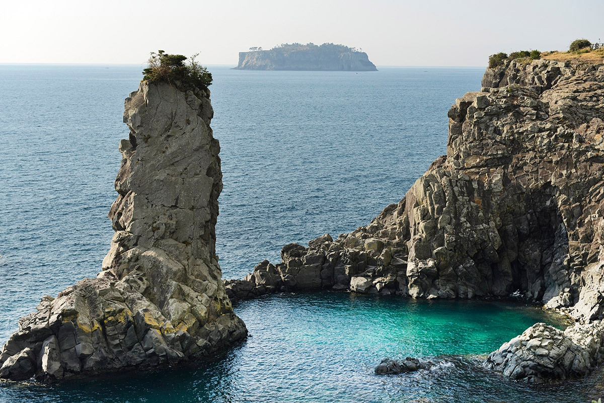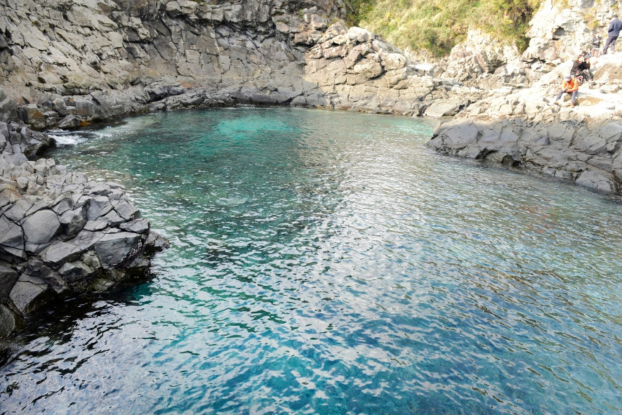 계단을 내려가며 먼저 만나게 되는 것은 황우지 12 동굴이다. 태평양 전쟁 말기 일본군이 미군의 본토 상륙에 대비해 만든 진지 굴이다. 아름다은 제주의 자연에 상처를 남기고 강제 노역으로 인한 제주 사람들의 고통이 서려 있는 곳이다. 계단을 다 내려가면 신선바위에 둘러싸인 선녀탕을 마주한다. 그야말로 무지개 타고 선녀가 내려와 머물렀을 법한 풍경이다. 옥빛 바닷물이 드나드는 천연 풀장으로 입장료도 없는 스노클링 명소로 알려진 곳이다.