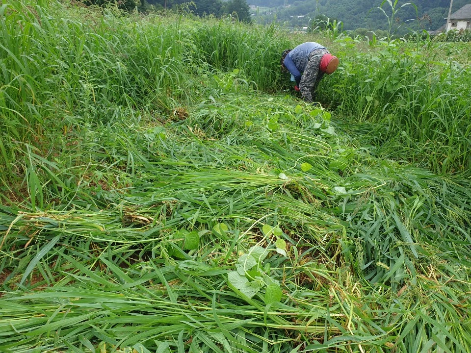 잡초를 뿌리째 뽑지 않고 잘라서 자연 멀칭으로 사용했다