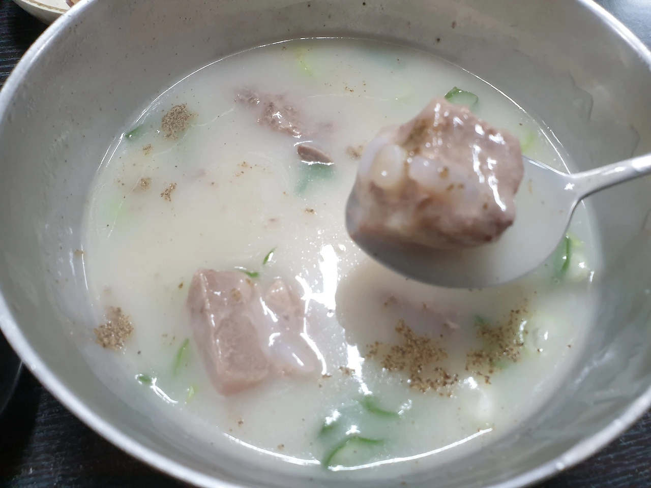 우리가 도착한 시각은 오전 10시 30분 경이다. 손님이 거의 없을 줄 알았는데 그 시간에 6~7개 정도 되는 테이블이 다 찼다. 기다렸다 자리에 않으니 주문도 받지 않고 바로 상이 차려진다. 메뉴가 접짝뼈국 한 가지뿐이라서다. 단 한 가지 메뉴로 영업은 하루 4시간만 한다. 걸쭉한 국물이 독특하다. 묵직하고 고소한 맛이 조화를 이루어 감칠맛이 날 때 제주어로 "배지근 하다"라고 표현한다는데 딱 그 맛이다. 넉넉하게 먹으라고 처음부터 추가로 한 그릇을 더 내놓는