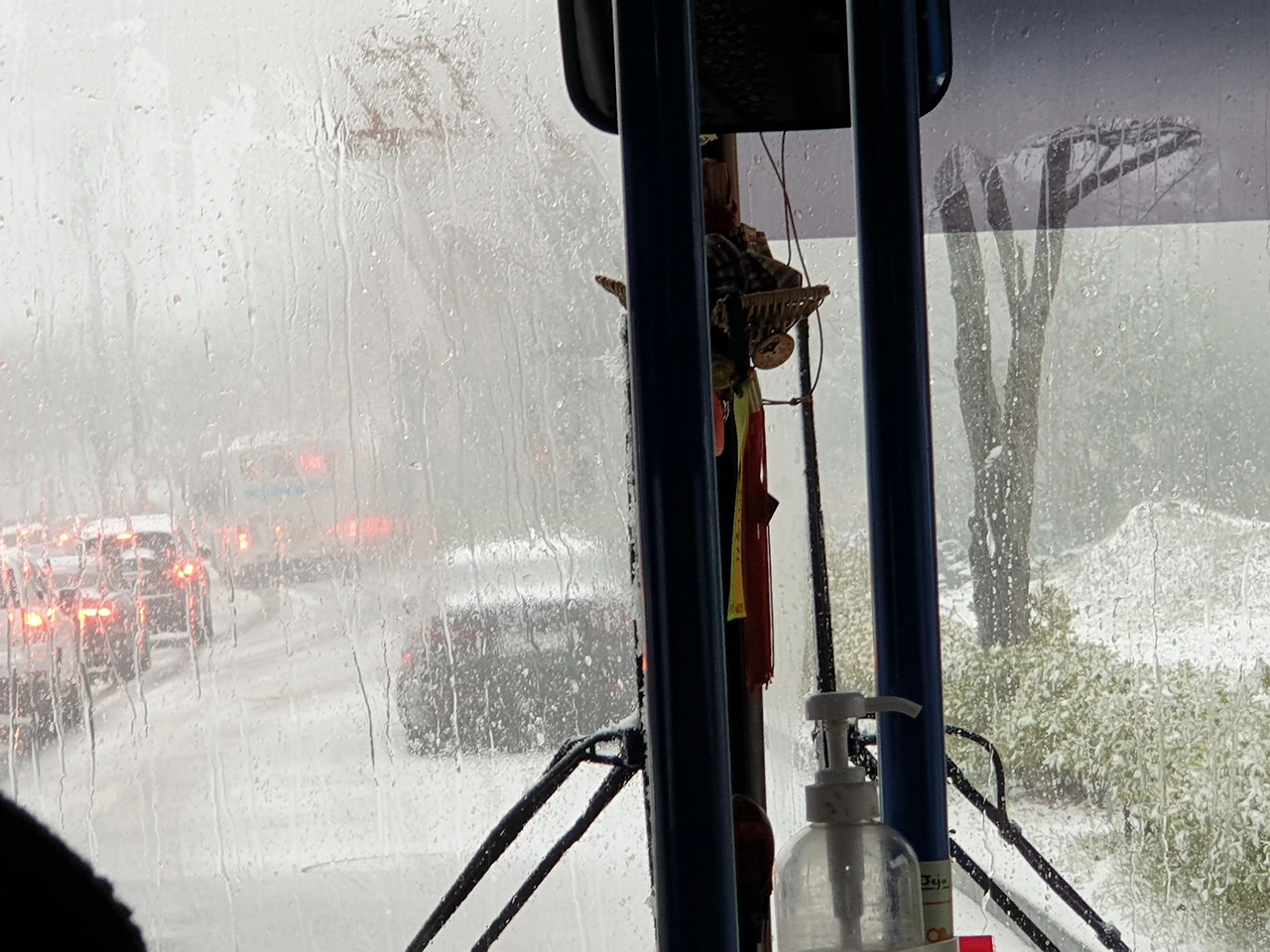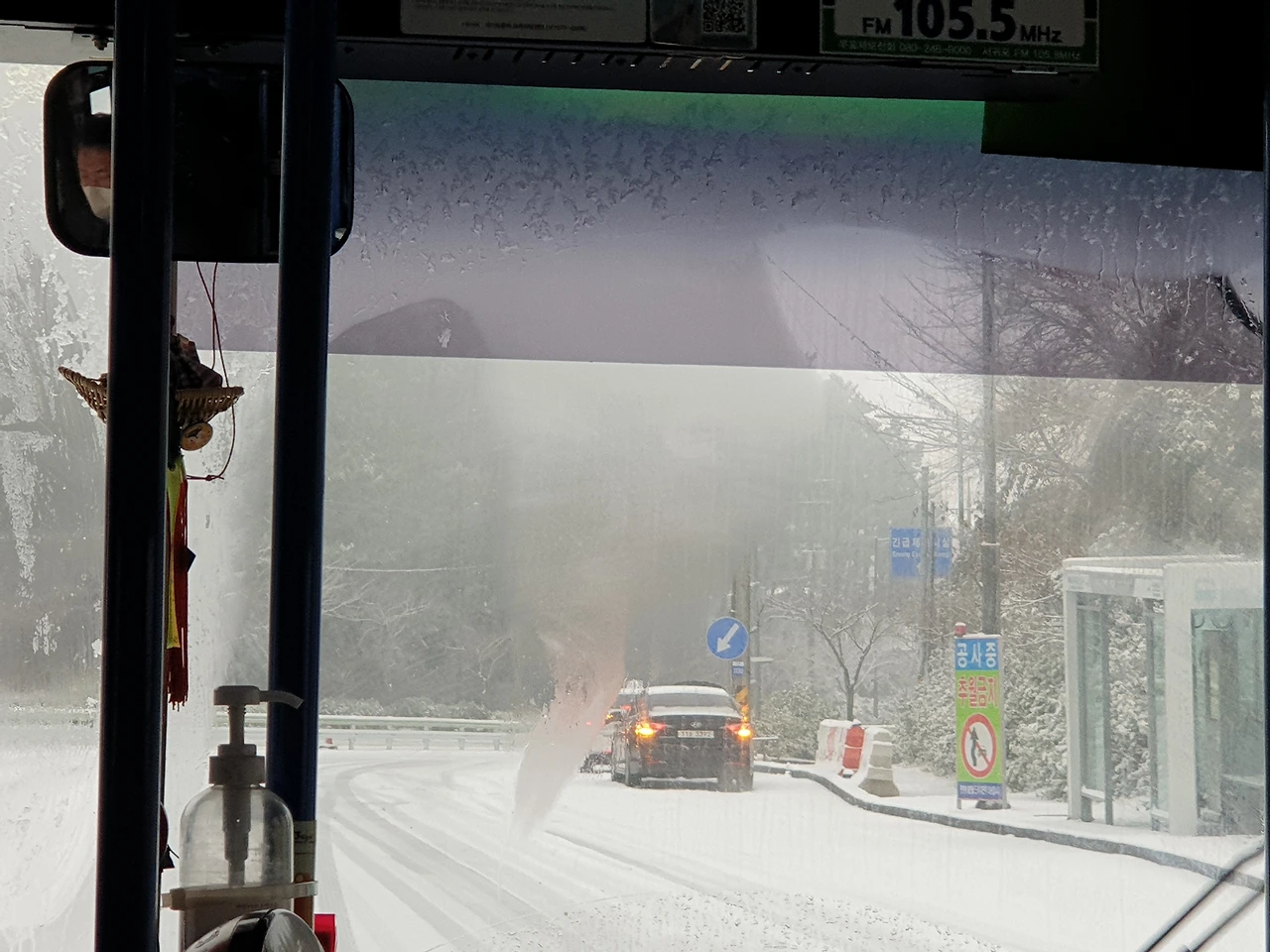 비행기 결항이 생길 수도 있고 공항까지 가는 것도 쉽지 않겠구나 싶었다. 숙소가 있는 서귀포는 아침에 보슬비가 내리는 수준으로 아무 문제가 없었다. 서귀포에서 제주공항까지 가려면 예상 소요시간이 1시간 20분이다. 제주 날씨는 언제 어떻게 변할지 아무도 알 수 없다. 하여 3시간의 여유를 두고 공항으로 가는 버스에 올랐다. 서귀포를 벗어나자마자 기상은 거짓말처럼 변했다. 성판악으로 향하는 길은 눈보라가 매섭게 몰아쳤다. 바닥은 이미 눈이 푹푹 쌓였고 주변엔 버려놓고 간 승용차가 여기저기 눈에 띈다. 갈수록 상황은 악화되었다. 짙은 안개에 휩싸인 듯 한 치 앞도 안 보이는 눈보라 속 구불구불한 산길에 버스가 굴러간다는 게 신기할 따름이었다. 베테랑 버스 기사님이 아니고서는 도저히 갈 수 없는 길이었다.