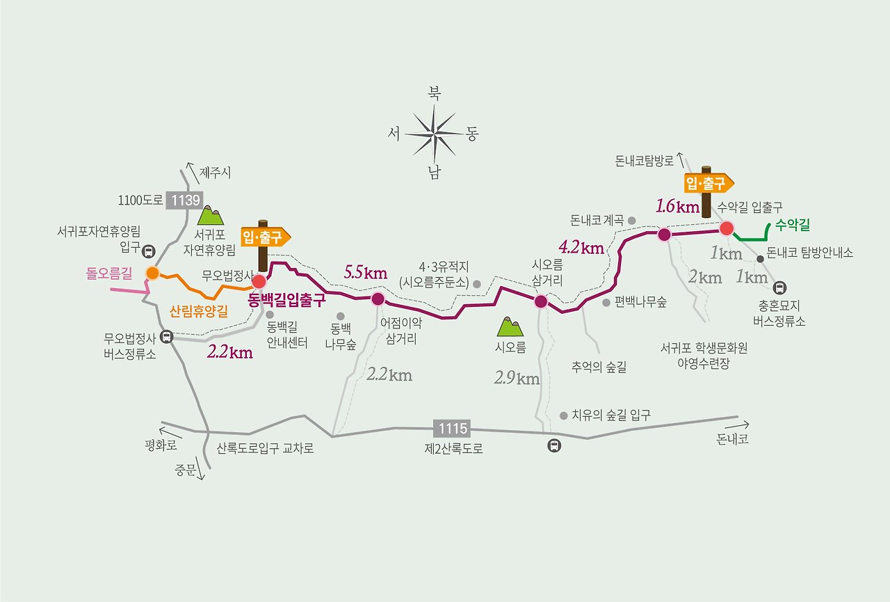 숙소에서 버스로 접근할 수 있는 가장 가까운 지점을 찾았다. 서귀포 치유의 숲길 입구다. 전에는 아예 버스가 다니지 않아 대중교통으로는 갈 수 없었던곳인데 버스 노선 하나가 생겼다. 치유의 숲길에서 4구간 둘레길과 만날 수 있는 지점이 있었다. 하여 출발지를 치유의 숲길로 잡았다.