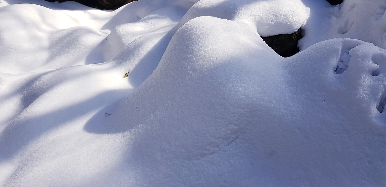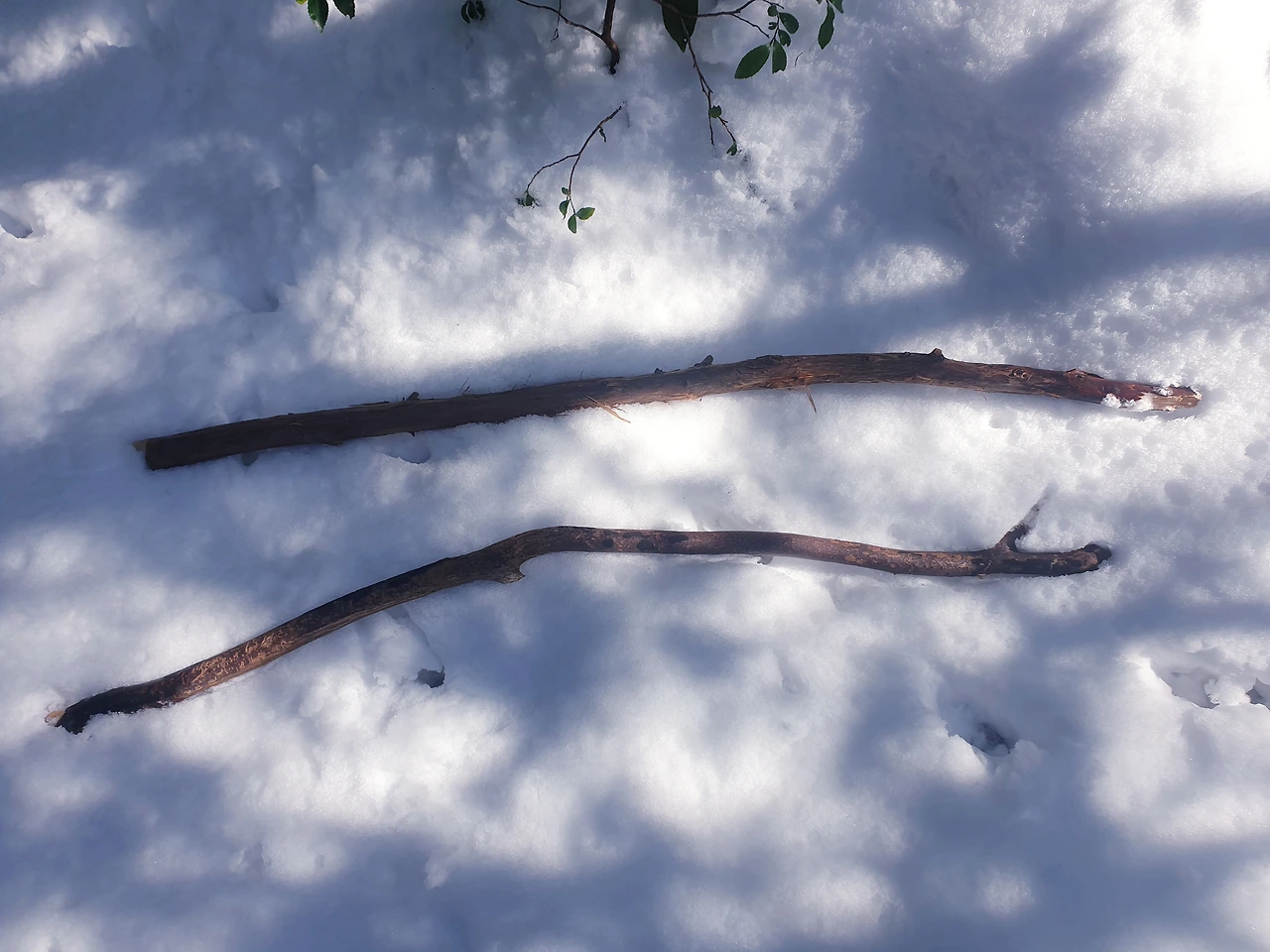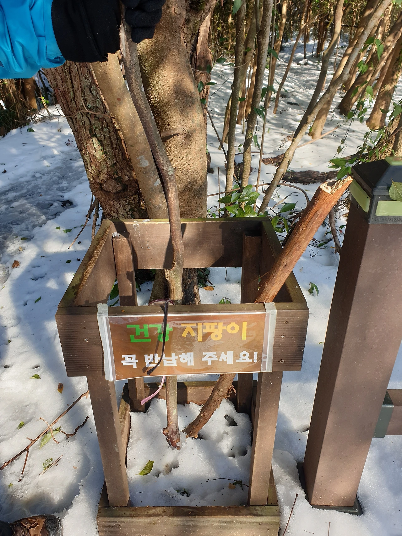 눈 위에 남겨진 발자국 따라갈 수 있는 곳까지만 다녀와보기로 했다. 입구에 나무 가지로 만든 건강 지팡이가 우리를 기다린 듯 딱 두 개 남아 있다. 그날 이 지팡이가 스틱 역할을 톡톡히 해주었다.