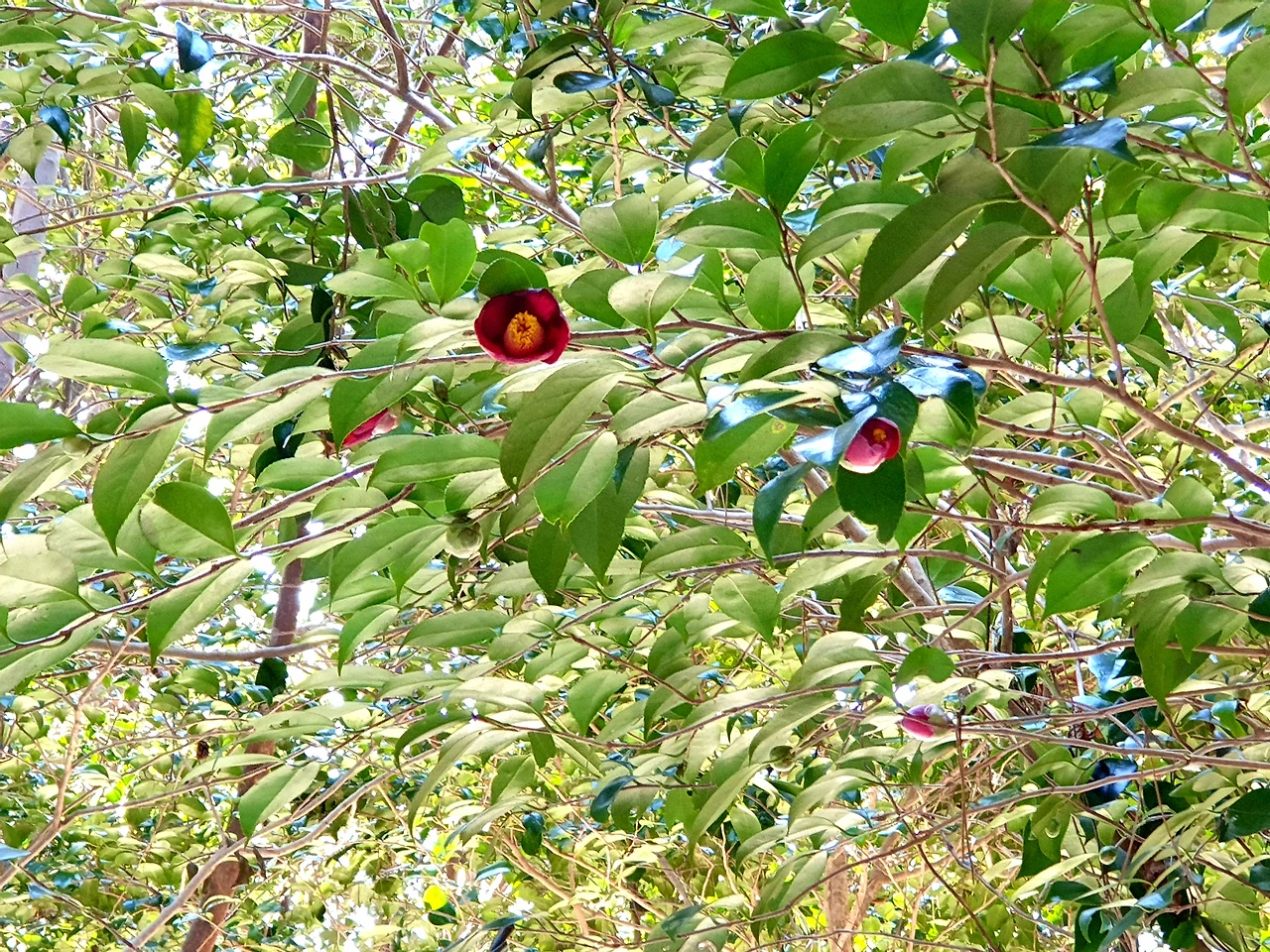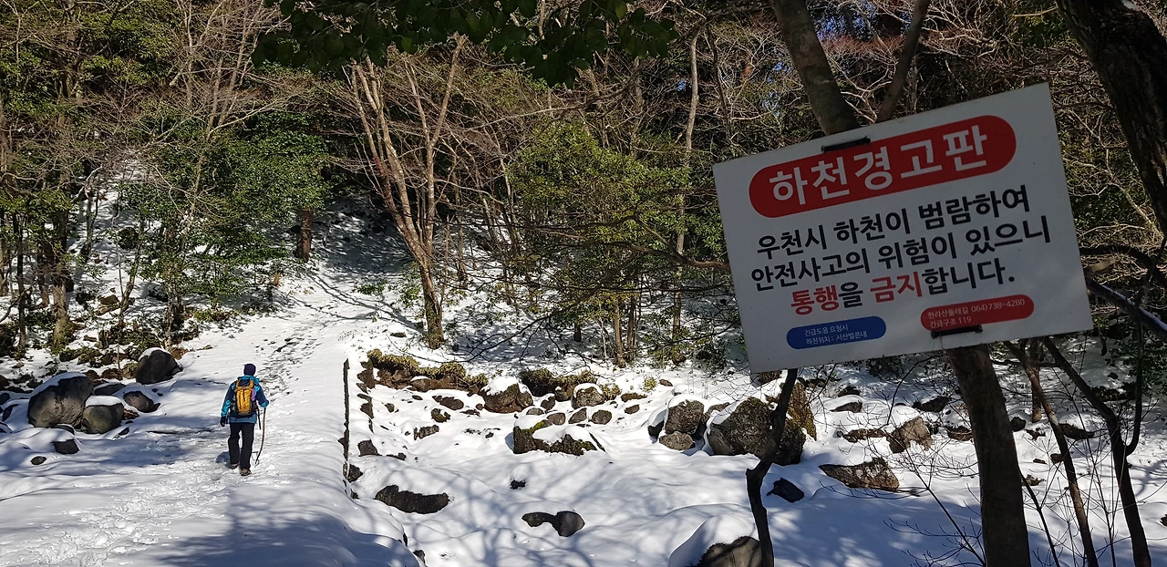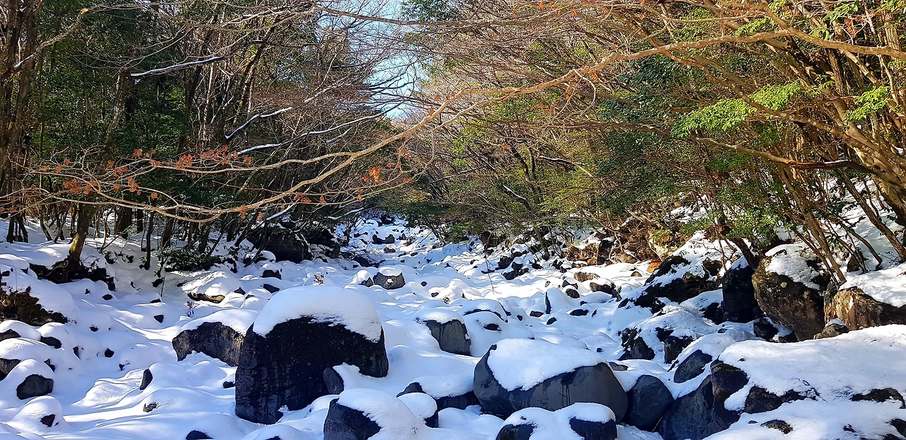 쭉쭉 뻗은 편백나무 숲길을 지나 곳곳에 동백나무가 무리 지어 있다. 산동백은 봄이 되어야 붉은 꽃을 피워내지만 간간히 피어난 꽃들과 반갑게 눈 맞춤도 한다. 도착지인 돈내코 탐방센터까지 가는 길은 그리 어렵지 않다. 하지만 계곡 구간이 여러 번 있다. 크고 작은 바위들이 눈에 덮여 형체를 알 수 없으니 잘못 발을 디디면 쭉 미끄러지고 물에 풍덩 발이 빠지기도 해 위험하기도 하다. 앞서 남겨진 발자국이 그토록 소중하고 감사하게 느껴진 것도 처음이다.