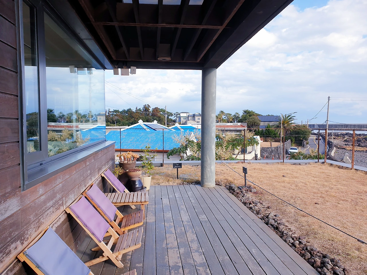 1층 내부는 마치 거실 공간처럼 테이블이 여유롭게 배치되어 있다. 넓은 창의 폴딩도어는 활짝 열어 바다를 끌어들였다. 사람도 북적이지 않으니 그야말로 편안하게 멍 때리기 좋은 분위기다. 우리는 잠시 카페 내부를 둘러보고 주문한 커피와 주스를 들고 나왔다. 바로 건너편에 있는 승민의 작업공간 창가에 자리 잡았다.