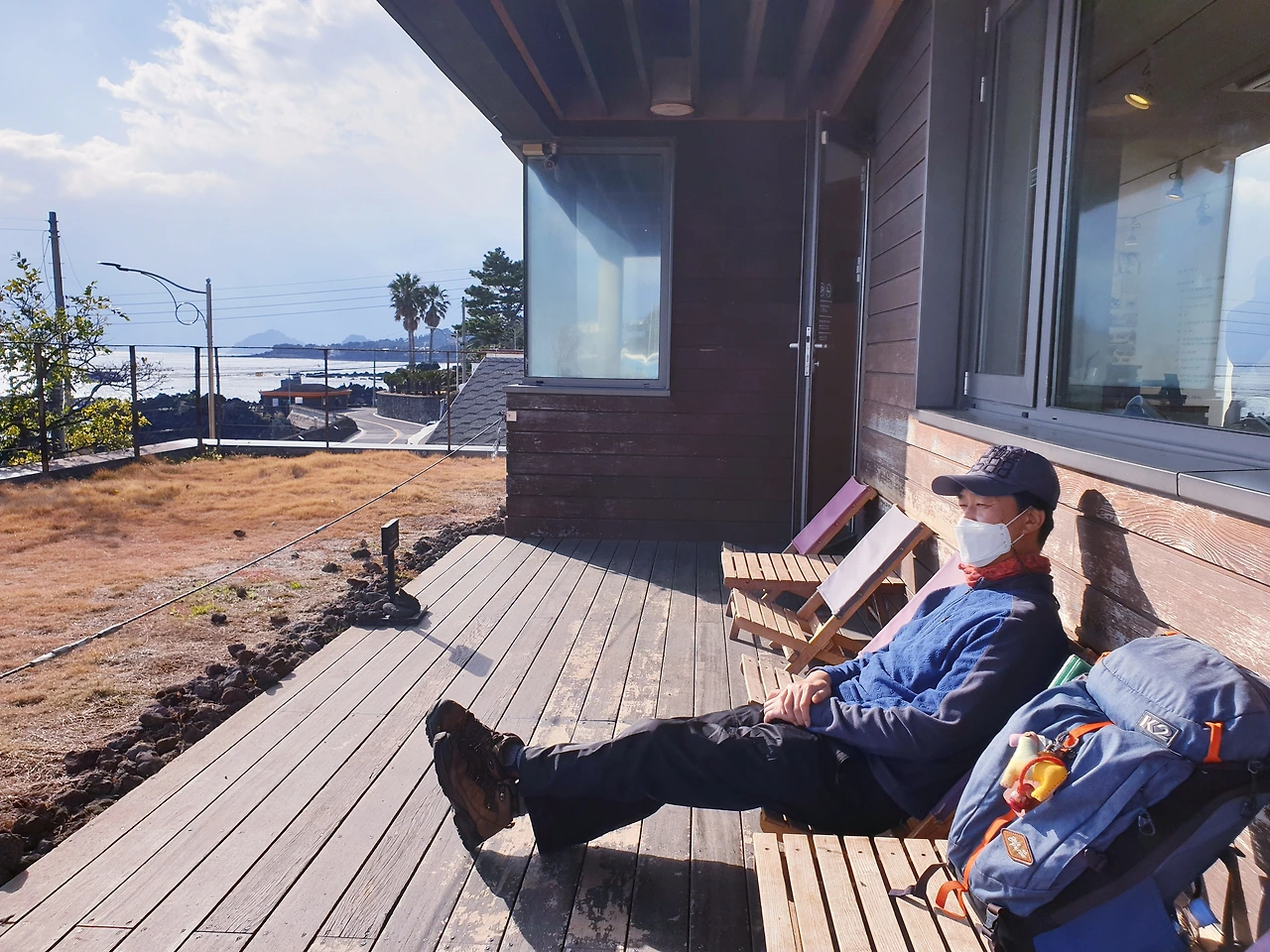 버스를 타고 위미항까지 이동했기에 얼마 걷지 않아 바로 카페 서현의 집이 나왔다. 전에 걸으며 외부에서만 바라보고 지나갔던 곳이다. 영화를 보며 루프탑에 초록 잔디가 깔려 있고 탁 트인 바다뷰가 인상적인 곳이었다. 계절적으로 잔디는 누렇게 변해 있었지만 그 모습 그대로 느껴볼 수 있어 좋았다.