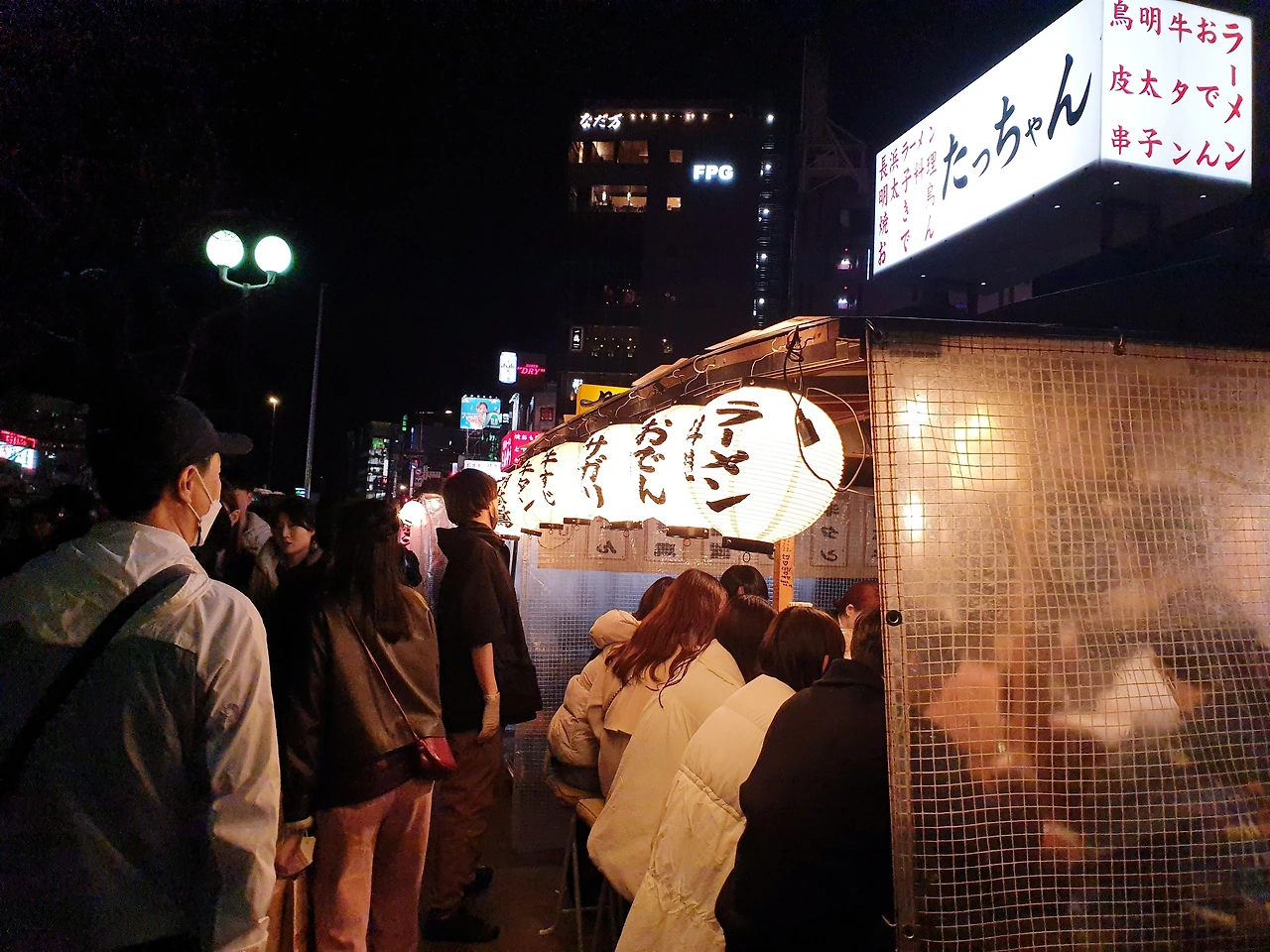 숙소로 돌아오는 길 캐널시티 주변에 포장마차들이 줄지어 서있다. 포장마차 안팎으로 북적이는 사람들 거리 식당(맛집) 앞 길게 줄 서서 기다리는 사람 대부분이 한국인이다. 포장마차 분위기를 느껴보고 싶었지만 그냥 패스했다.