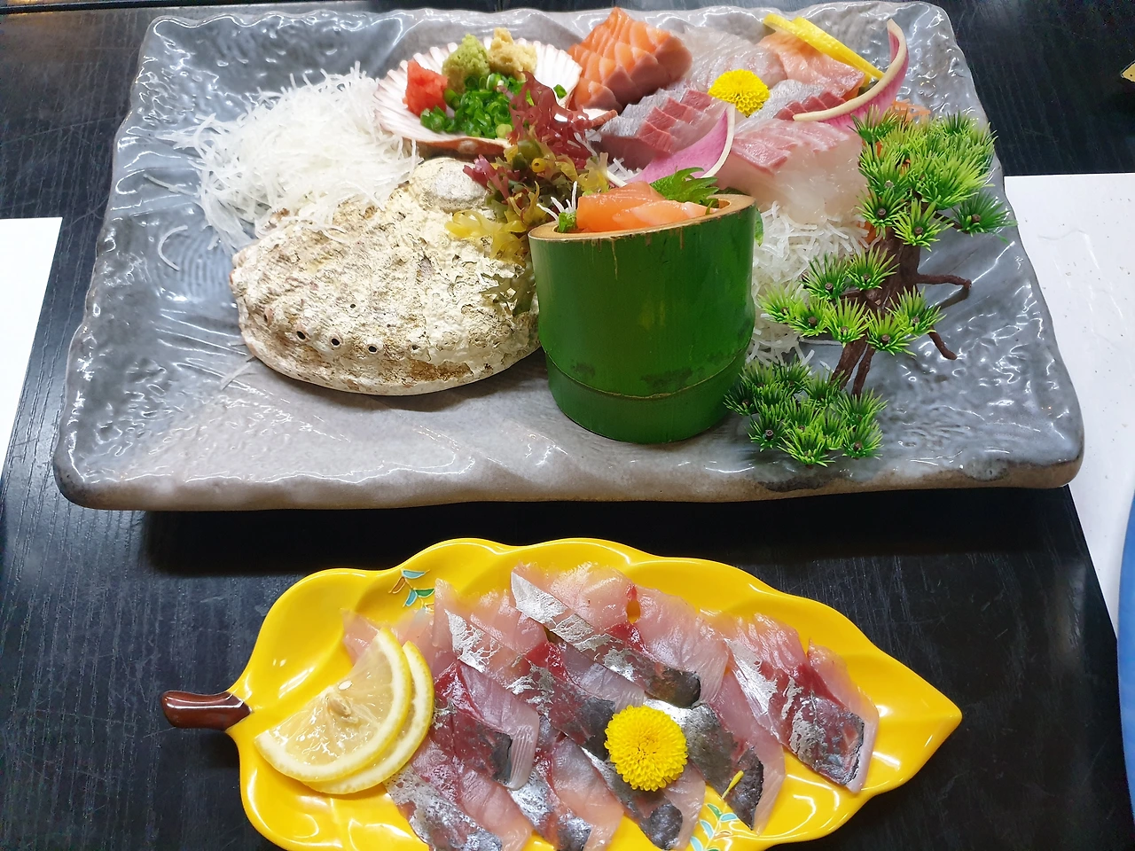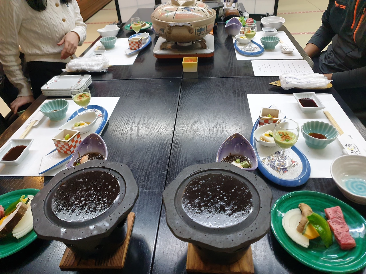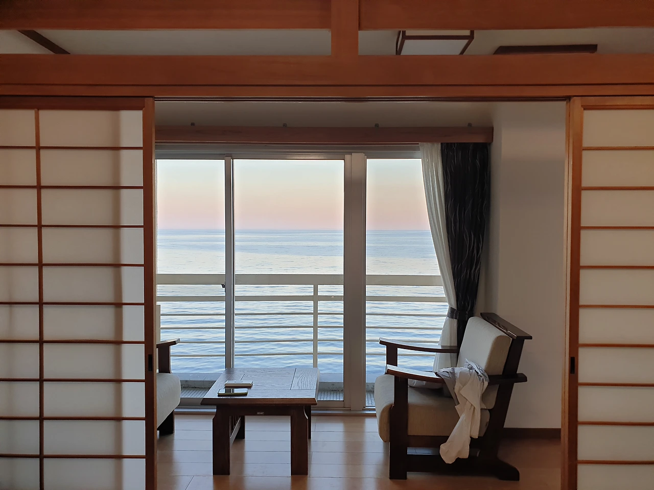 서둘러 숙소에 도착하니 우리가 맡긴 짐을 객실로 다 옮겨놓았다. 객실은 5층이었고 테라스에서 바다뷰가 시원하게 펼쳐졌다.기왕 전통체험 하는 거 유카타로 갈아입고 갔으면 좋았을 걸 그럴 시간도 없이 입던 옷 그대로 입고 식당으로 내려갔다. 카이세키는 객실에 차려주는 곳도 있지만 이곳은 2층 식당으로 내려오라고 했다.