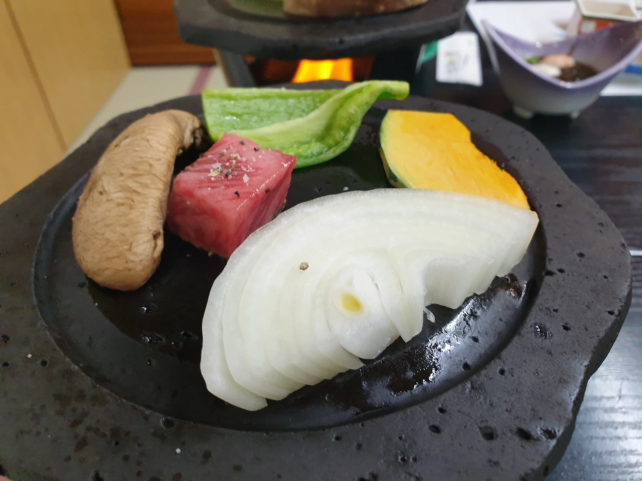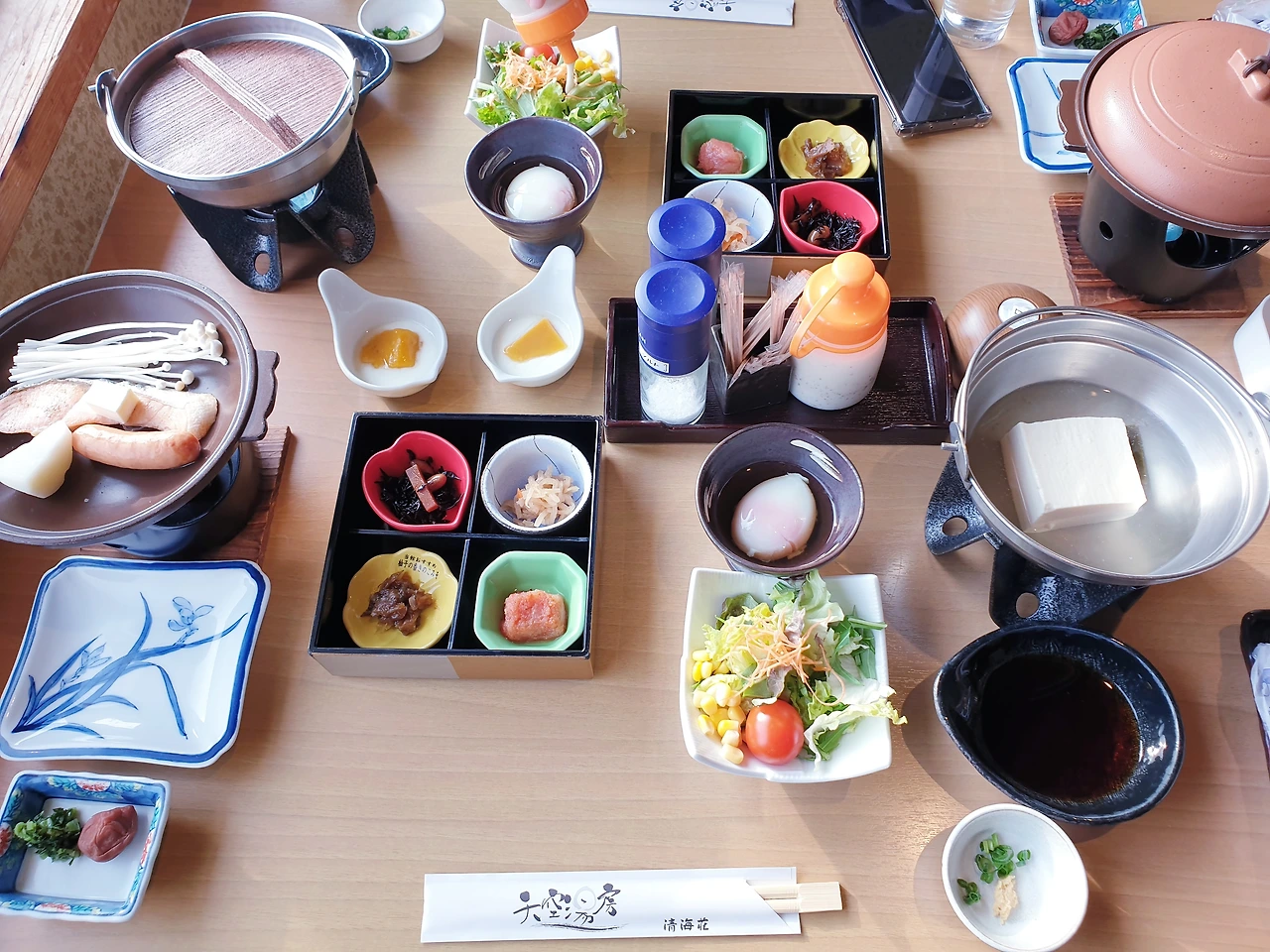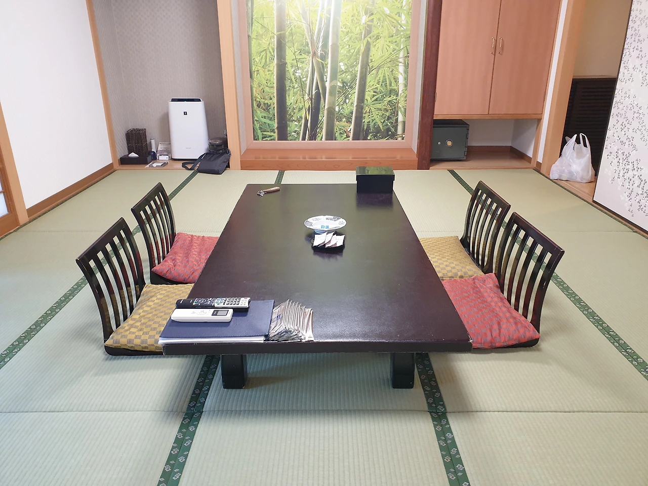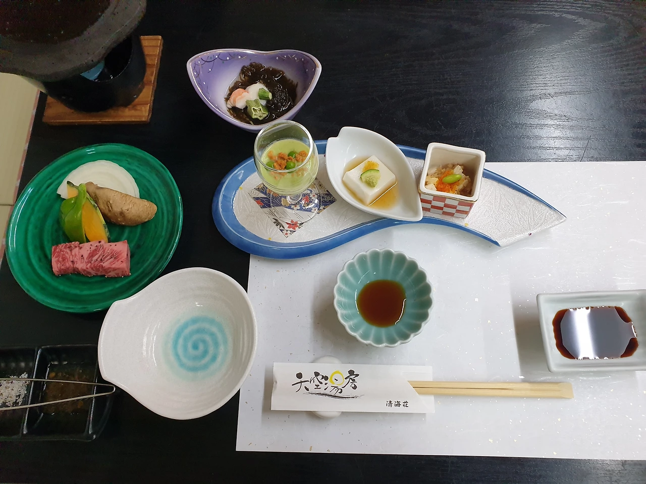 서둘러 숙소에 도착하니 우리가 맡긴 짐을 객실로 다 옮겨놓았다. 객실은 5층이었고 테라스에서 바다뷰가 시원하게 펼쳐졌다.기왕 전통체험 하는 거 유카타로 갈아입고 갔으면 좋았을 걸 그럴 시간도 없이 입던 옷 그대로 입고 식당으로 내려갔다. 카이세키는 객실에 차려주는 곳도 있지만 이곳은 2층 식당으로 내려오라고 했다.