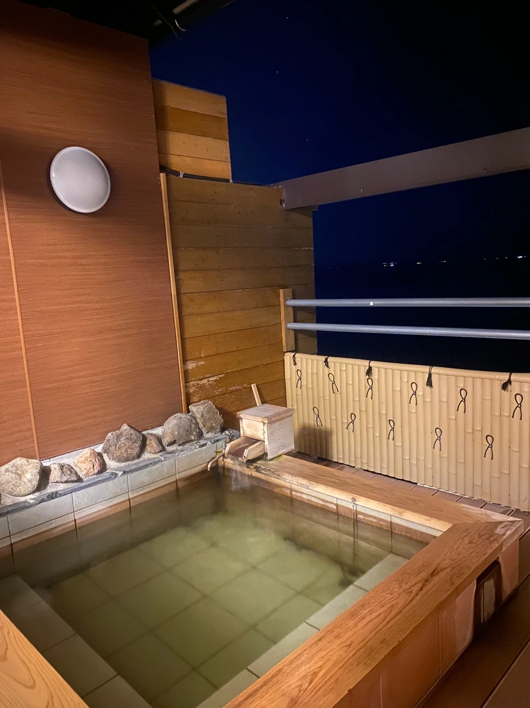 식사를 끝내고 객실로 돌아오니 두툼한 요와 이불로 깔끔한 이부자리가 펼쳐져 있다. 가족탕을 7시 30분으로 예약했으니 급히 유카타로 갈아입고 남편은 혼자 대온천장으로 가고 두 딸과 나는 가족탕이 있는 옥상으로 갔다. 옥상으로 올라가는 계단에서 벳푸타워 야경을 바라볼 수 있었다. 노천탕으로 바다전망이지만 이미 캄캄한 저녁이다. 쌀쌀한 저녁 기온에 오돌돌 떨며 좁은 탕에 들어가 있다가 제대로 씻기라도 하려고 나는 대온천장으로 갔다. 대온천장의 통유리 너머로도 가족탕과 같은 바다 전망이다. 뜨끈하고 얼마나 좋던지 게다가 아무도 없어 혼자 독차지하고 온천욕을 즐겼다.