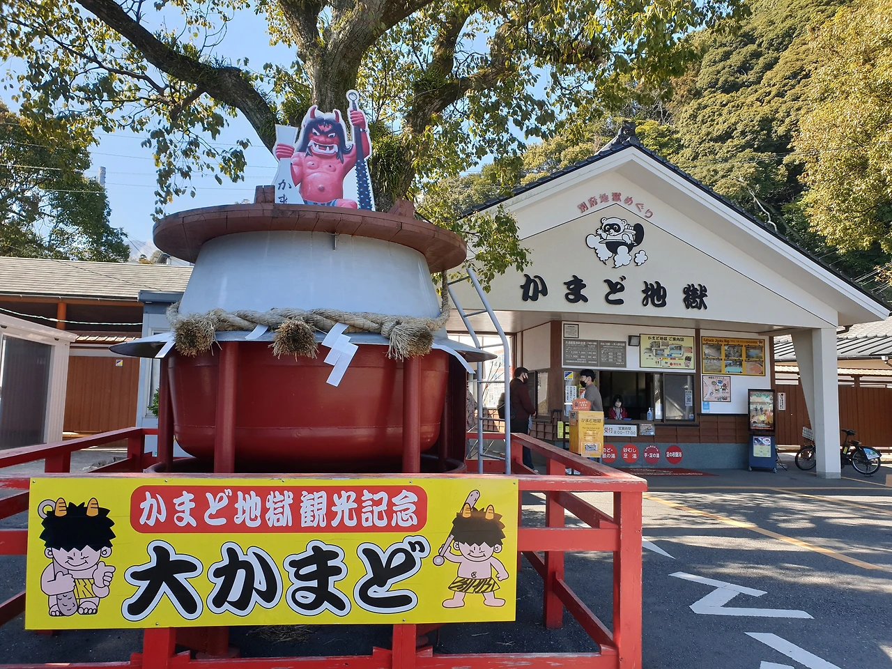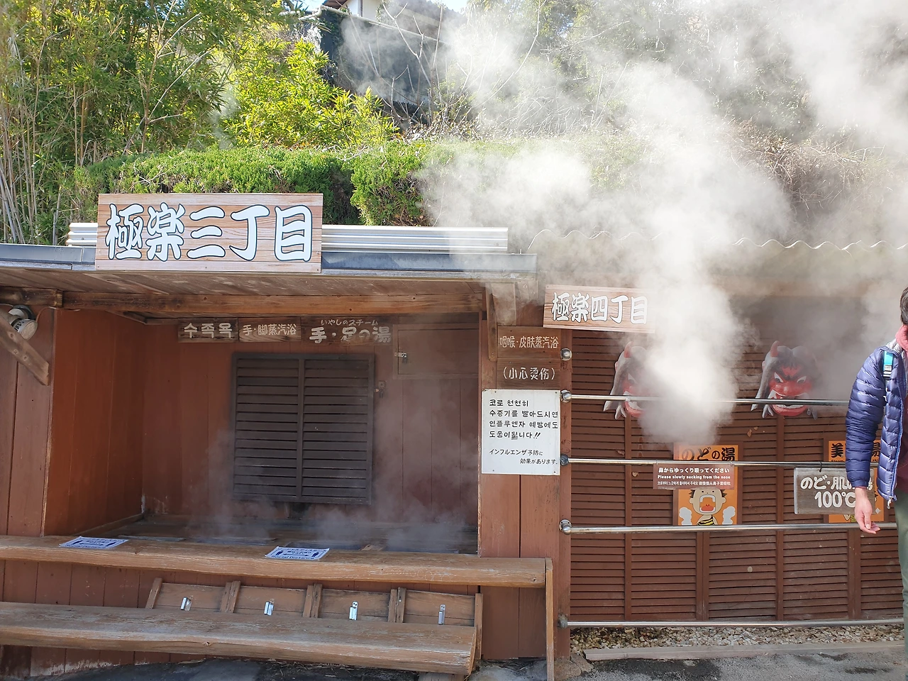 전에 가보았던 곳으로 코발트빛 바다를 연상하게 하는 우미(바다) 온천이 괜찮았다. 처음 온 두 딸에게는 우미(바다) 온천 입장권을 끊어주고 우리 부부는 근처에 있는 가마도(가마솥) 지옥을 다녀왔다. 관람용 온천이지만 우미지옥도 그랬고 가마도지옥도 족탕이 있다. 온천수에 발을 담그고 잠시 피로를 풀며 쉬어갈 만하다. 온천수로 찐 달걀도 맛보고 온천수를 이용한 상품도 판매하고 있어 두루 즐겨도 한 곳에 1시간 정도면 충분하다. 가마솥지옥은 온천수도 맛볼 수 있고 양말 신고 발바닥 찜질 하는 곳도 있다. 바로 옆으로 증기가 솟아 나는 곳에서 목이나 코로 수증기를 빨아들이면 인플루엔자 예방에도 좋다고 한글로 써놓았다.