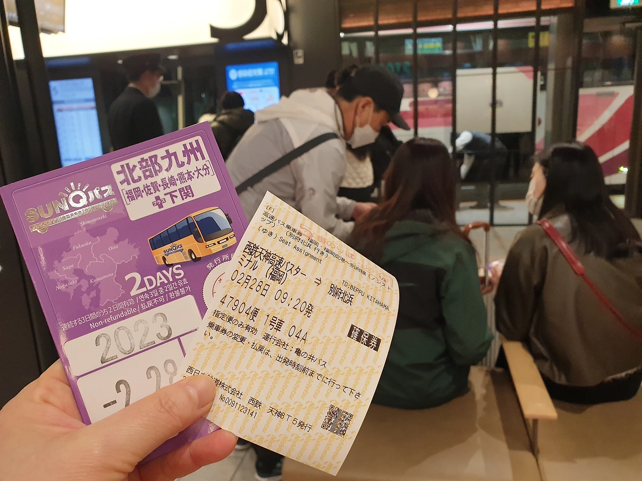 여행 둘째 날은 벳푸로 이동해 하룻밤 머물고 다음날 오후 다시 텐진으로 돌아오는 일정이다. 벳푸를 다녀오기 위해 한국에서 미리 산큐패스 2일권을 구매했다. 벳푸 다녀올 때까지 이틀 동안은 고속버스와 대부분의 시내버스 일부 선박까지 무제한으로 이용할 수 있다. 뿐만 아니라 다양한 할인 혜택도 누릴 수 있다. 우리는 미처 생각을 못해 20%나 해주었던 관광지 입장료 할인 혜택도 받지 못했다.