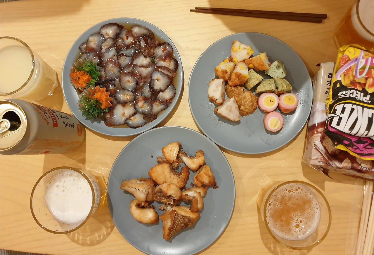 비도 내리고 쉴 곳으로 들어온 편안함에 저녁 먹으러 또다시 밖으로 나가고 싶지 않았다. 아이들은 먼저 씻고 쉬게 하고 남편과 둘이서 저녁 먹거리 찾아 거리로 나섰다. 여기저기 돌아다니며 이것저것 골고루 사서 한 시간 만에 돌아왔다. 가까운 편의점에서 도시락 정도 사 올 줄 알았는데 푸짐한 저녁 만찬이라며 아이들이 좋아한다.