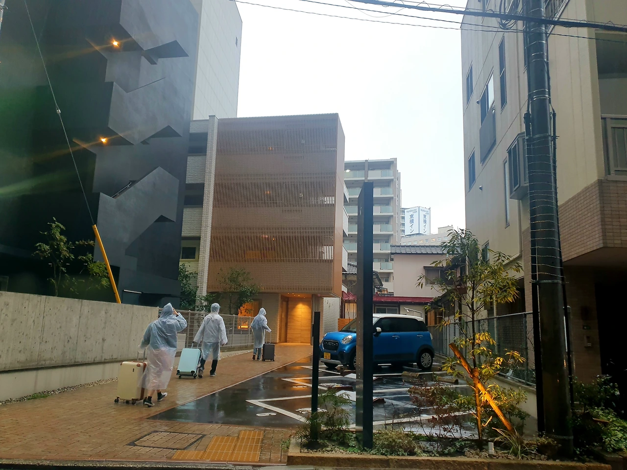 각자 가방에 챙겨간 1회용 비옷을 입고 걸어서 도착한 호텔. 무인 호텔이라 입구에 준비해 둔 작은 상자에 4인이 이틀 머무는 숙박세 1,600엔을 넣고 비밀 번호를 핸드폰으로 전송받아 객실로 들어갔다. 네 가족이 넉넉하게 사용할 수 있는 공간이다. 용도에 따라 분리된 구조, 청결함, 전날 이용한 료칸보다 더 큰 욕조가 있고 온천수까지 나온다. 무인이라 불편한 건 단 하나도 없었다. 모든 게 만족스러워 다음에 다시 이용하고 싶은 곳이었다.