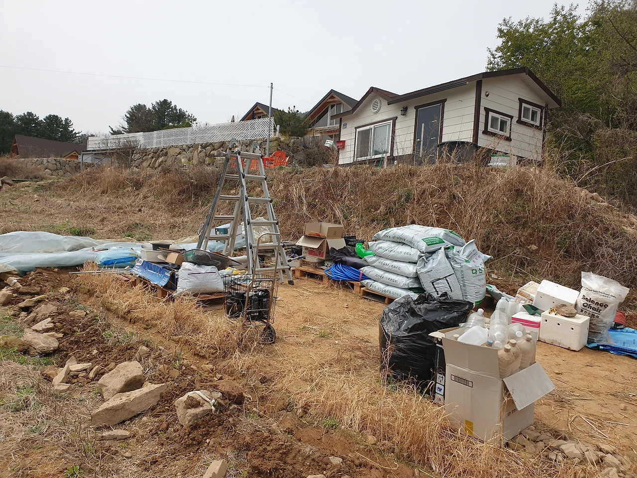 농막에 도착해 짐을 풀자마자 비닐하우스 이전 준비를 했다. 작년에 농막 바로 아래쪽에 농기구 보관하는 창고로 사용하려고 이웃집 도움을 받아 문도 없이 대충 형태만 갖춰지었었다. 한 해 유용하게 잘 썼는데 올해 토목공사를 하려면 없애야 한다. 시골은 뭐든 남의 손을 빌리면 고비용을 지불해야 한다. 그러다 보니 셀프로 해결하며 배우는 노력이 필요하다.
