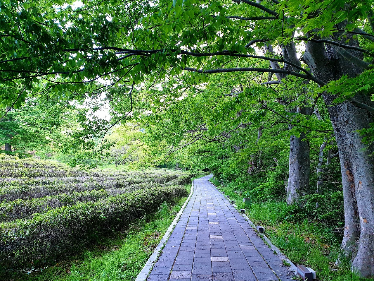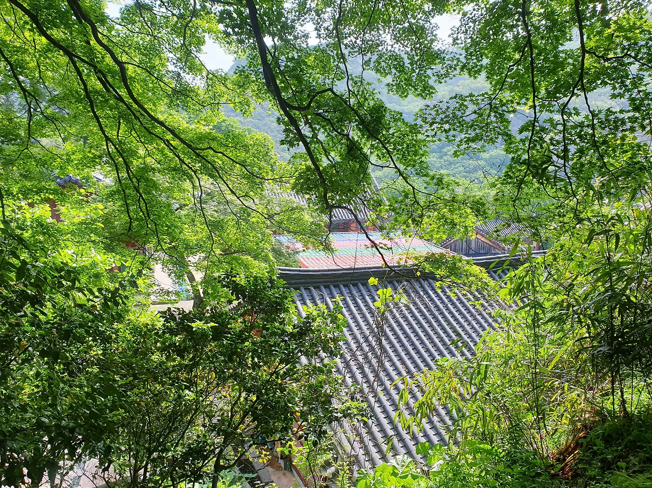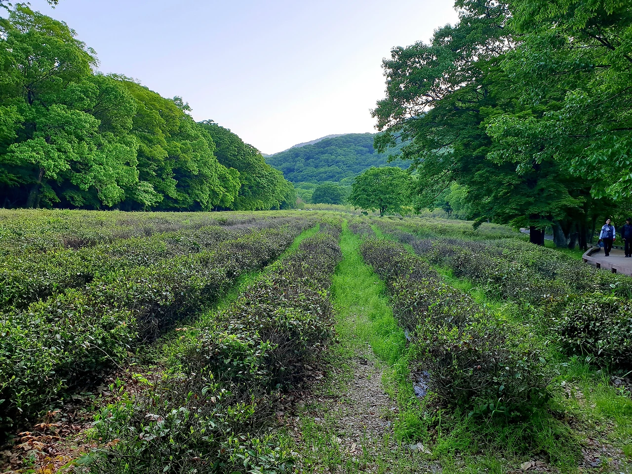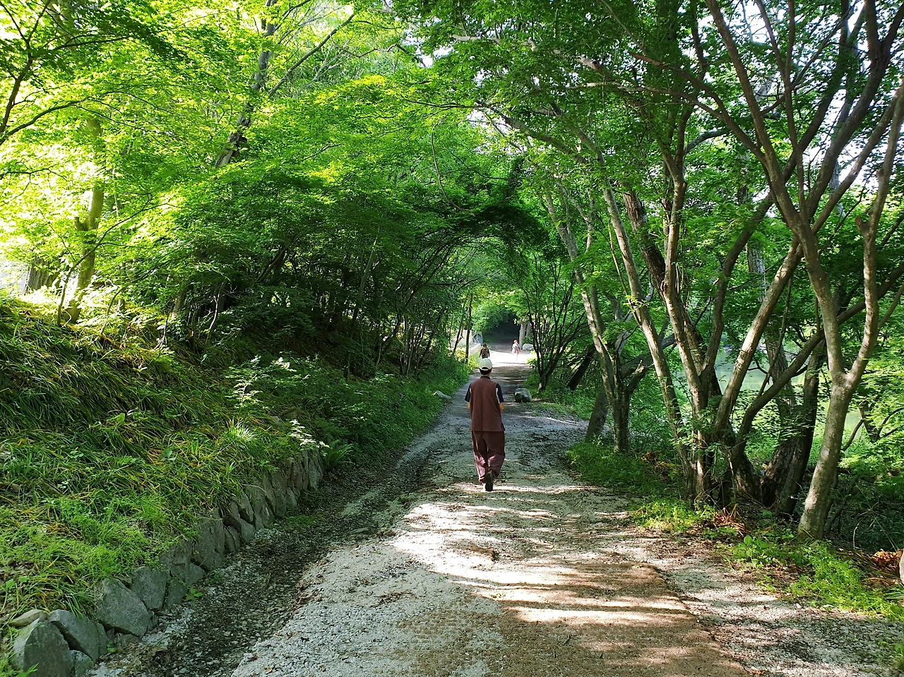 숙소에서 공양을 위해 경내까지 10~15분 정도 걸어야 한다. 계곡을 사이에 두고 양쪽으로 길이 나 있다.숲 속 오솔길을 걷는 맛이 그만이다. 공양을 마치고 다시 숙소로 돌아오는 길은 무장애길을 택했다. 한쪽엔 차밭이 펼쳐지고 다른 한쪽은 오랜 수령의 나무들이 길게 길까지 드리워졌다. 계곡물 흐르는 소리와 함께 차밭에서 차를 따는 고즈넉한 풍경이 그림처럼 펼쳐진다.