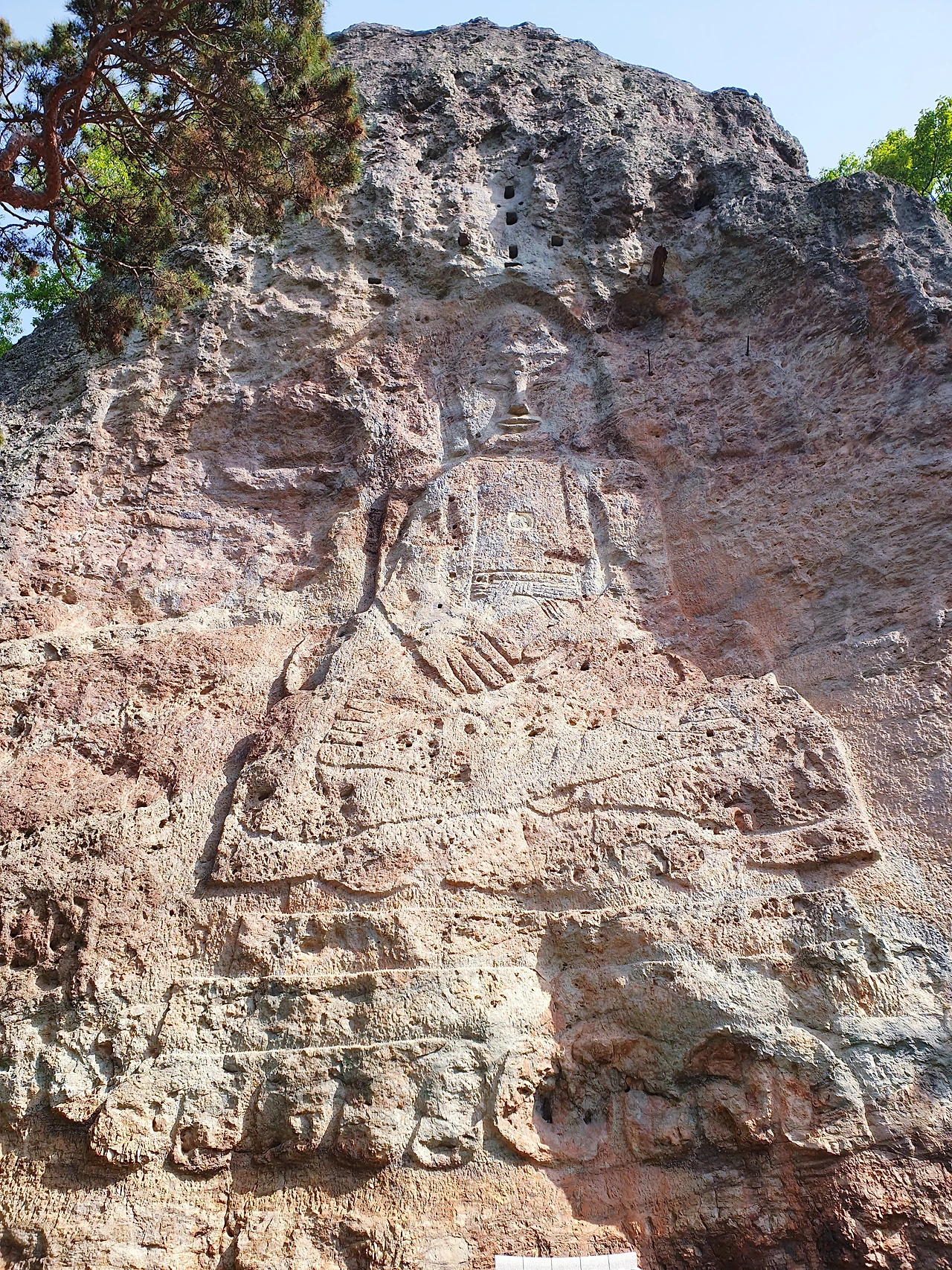 하산하는 길은 낙조대를 거쳐 능선을 타고 내려오니 한결 수월하다. 용문굴을 지나 도솔암에 도착하기 전 조금 전 건너편 산에서 내려다보았던 마애여래좌상을 가까이서 만났다. 커다란 바위벽에 신체 높이 15.7m로 연꽃무늬를 새긴 받침돌에 앉아있는 모습이 장엄하다.