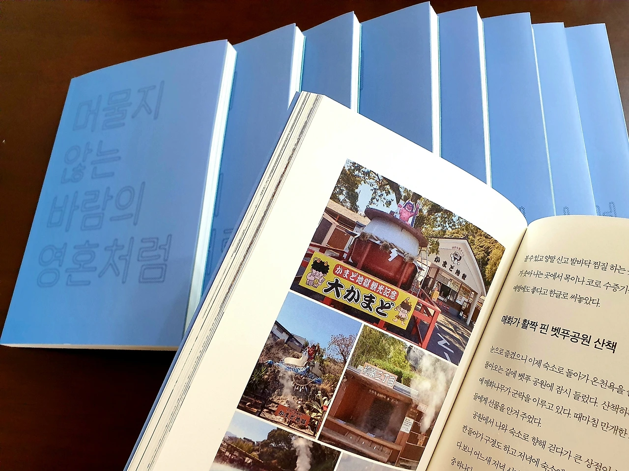 집에서 걸어갈 만큼 가까운 거리지만 우리 부부는 알지 못했던 특별한 파스타 식당을 딸이 예약했다. 내가 좋아하는 스타일의 음식과 맛이 행복감을 더해줬다. 식사 후 집으로 돌아와 먹기 아까울 만큼 예쁜 케이크로 온 가족의 축하를 받았다. 잠시 후 큰딸이 큼직한 서류봉투 하나를 건넨다. 봉투 안에는 책 한 권이 들어 있었다. '머물지 않는 바람의 영혼처럼' 책 제목이 어디서 많이 본듯한 느낌! 어! 하는 순간 작은 딸이 내미는 여러 권의 같은 책. 아니 이게 뭐야! 하는 순간 딸이 "맞아 엄마 블로그 이름이잖아" 한다. 가끔 브런치에 올리는 글 외에 다른 SNS 활동을 접은 지 몇 년째가 되다 보니 블로그 이름도 가물가물해졌다. 두 딸이 엄마 환갑 선물로 특별히 준비해 만든 나의 책이다.