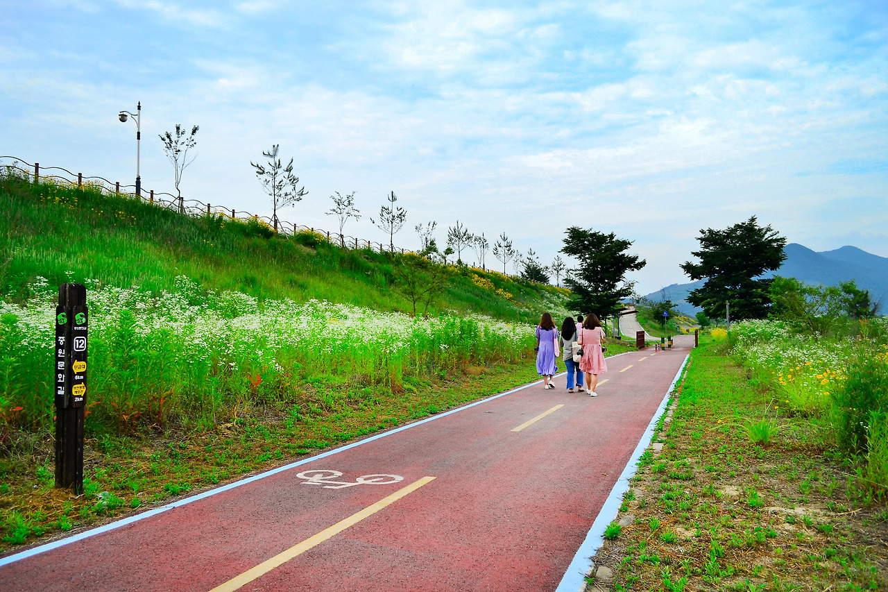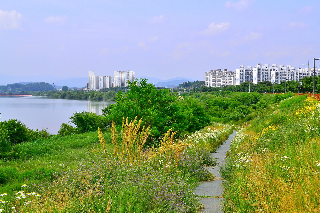 유유히 흐르는 남한강 따라 자전거길 옆으로 본격적인 중원문화길 1구간 걷기로 들어선다. 그늘이 없는 자전거길과 나란히 걷다 보면 혼자 자전거로 싱싱 달리거나 친구들과 사이좋게 네 발 자전거를 타는 사람들까지 다양한 탈 거리를 즐기는 사람들이 마냥 부러워지기도 한다. 그러다 얼마 지나지 않아 자전거길과 헤어져 초록의 싱그러움과 들꽃이 흐드러진 생태 탐방길에 닿으며 이내 마음은 '걷기 잘 했다!'로 돌아선다. 꽃길과 시원한 강바람이 그늘 없는 길을 걸은 보상이라도 해주듯 살갗을 간지럽히며 잘 왔노라 속삭인다. 그 길 끝 목행교로 올라서기 전 충주시민을 위한 게이트볼 연습장이 초록 잔디로 펼쳐지고 그곳에서 다시 자전거길과 합류한다.