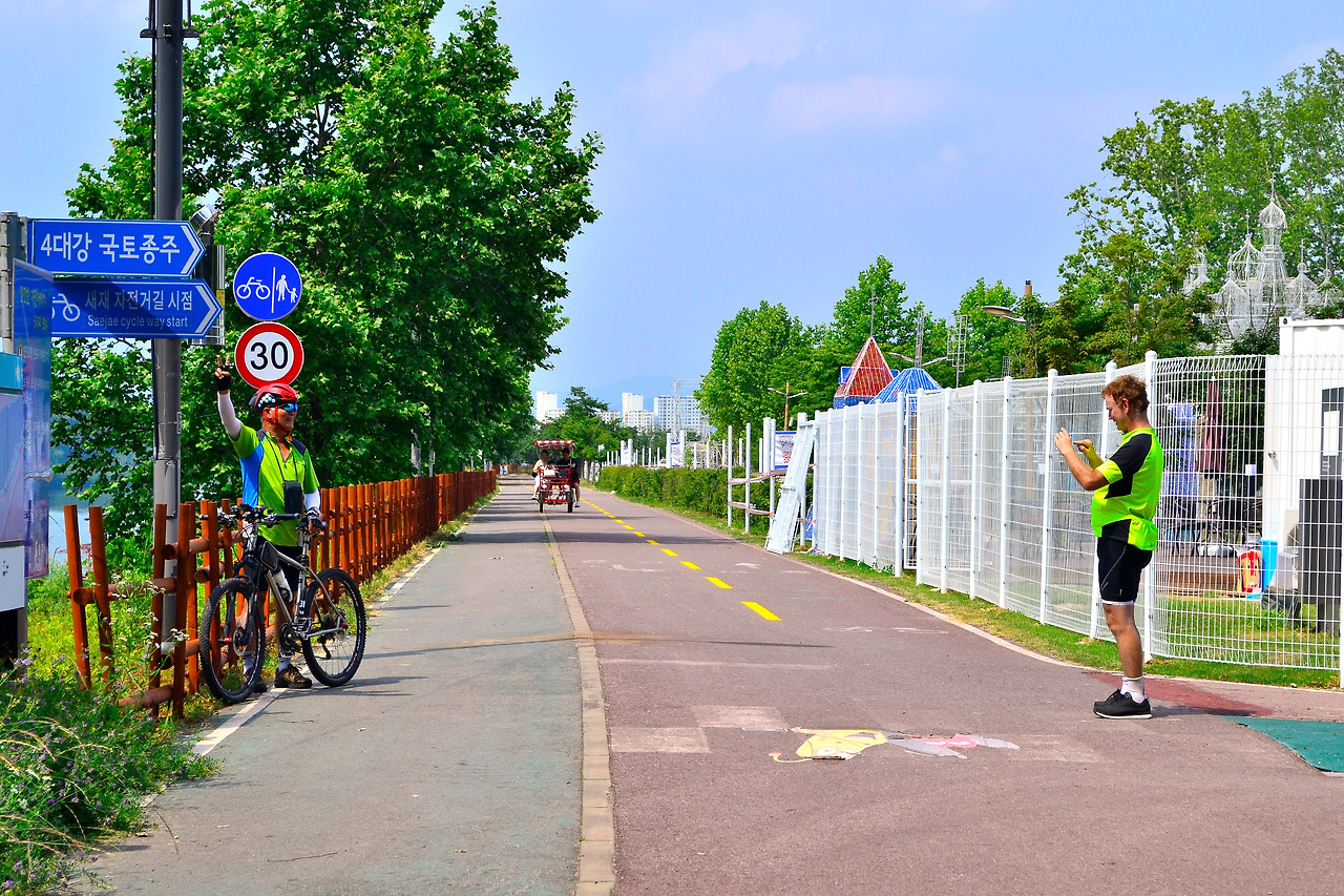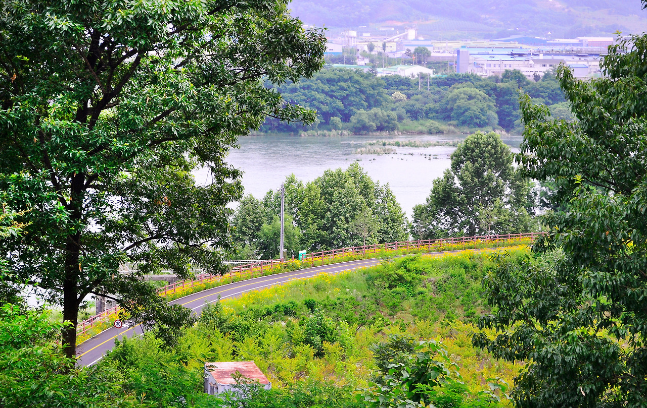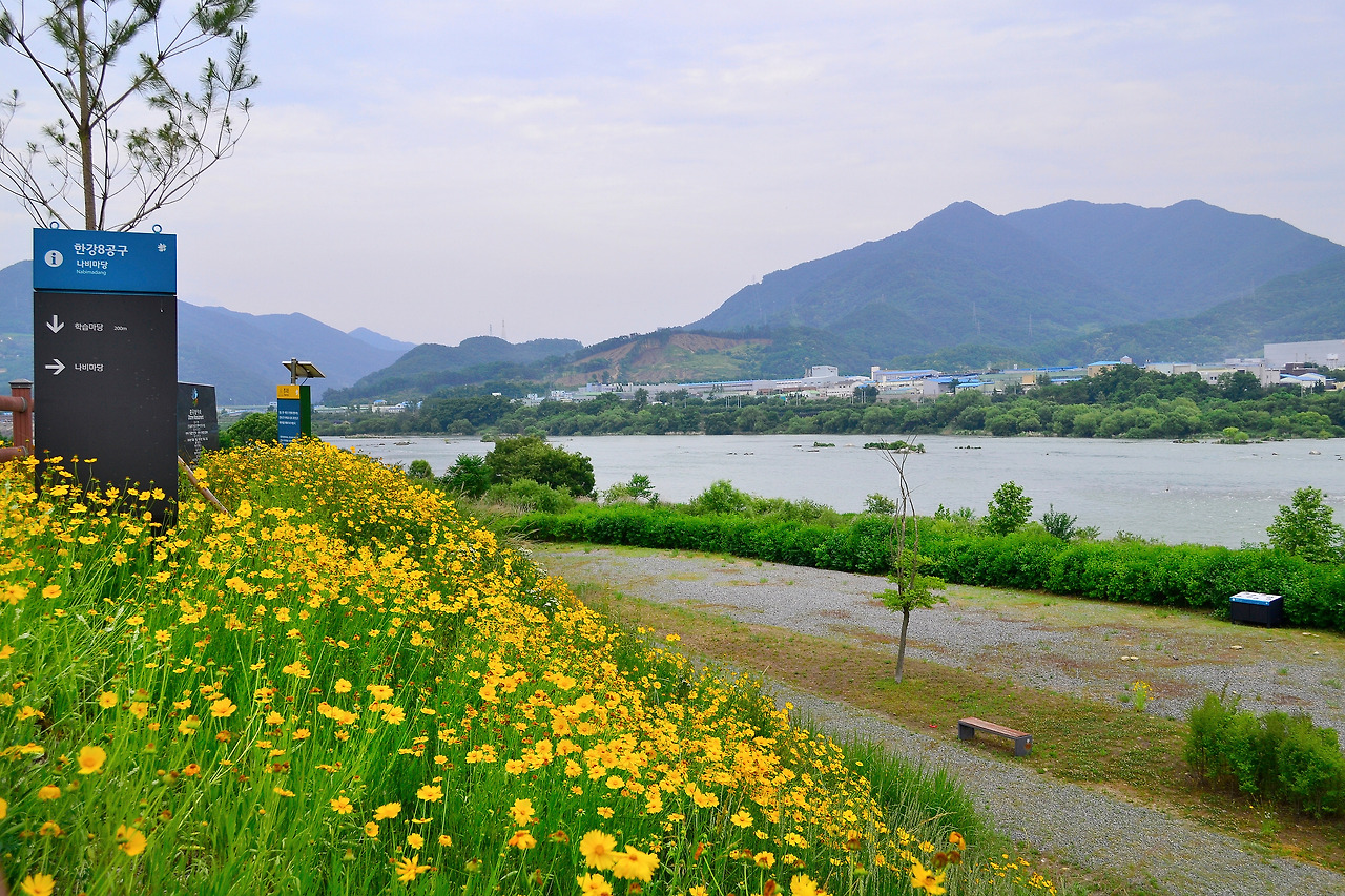 여름을 맞아 활짝 핀 노란 금계국은 길의 경계를 이룬다. 아랫길로 내려서면 안온한 느낌을 주고, 위로 올라서면 남한강과 함께 시원한 풍경이 펼쳐진다. 이 근사한 풍경은 충주자연생태체험관이 있는 곳까지 약 3.5km에 걸쳐 이어진다. 오가는 사람도 없고 자전거만 가끔 지나다니는 그 길을 어찌 알았는지 젊은 청춘들 몇몇이 카메라 들고 나타난다. 싱그러운 풍경과 활기찬 여행객기 어우러지니 시골 외갓집으로 가는 길목에서 마을 사람을 만난 듯 반갑고 정겹다.