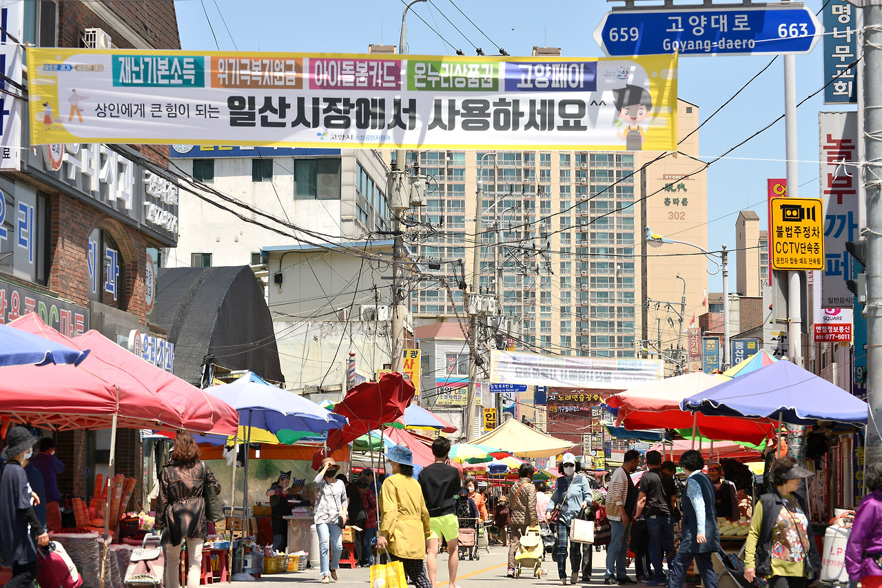 역 앞 일산시장은 오일장이 서는 날이면 사람들로 북적이고 시끌벅적 활기가 넘친다. 골목과 차도 옆으로 알록달록 파라솔이 길게 줄지어 섰다. 요즘 보기 드문 뻥튀기는 모습은 뻥이요를 외치는 대신 호루라기를 불고 펑! 소리와 함께 하얀 뻥튀기가 쏟아진다. 과일, 떡, 채소, 잡화 등 없는 것 빼고 다 펼쳐져 있다.