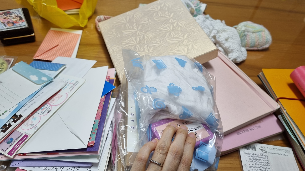 이틀 뒤 나는 옷장 속 보물상자를 꺼내왔다. 친정엄마가 주신 나의 어릴 적 돌반지와 은숟가락 그리고 걸음마 신발, 어른이 되어서 열심히 쓴 몇 안되는 일기장 두 권, 외국 생활하면서 기록한 것들 그리고 모아온 엽서 몇 장, 철없는 날의 스티커 사진들, 친구들과 수업시간에 주고받은 쪽지, 아이가 태어나고 처음 입혀본 배냇저고리와 탯줄 그리고 사진. 손수 뜨개질로 만들어준 아이들 모자와 손발싸개. 하나하나 지금은 구하지 못할 소중한 것들이다. 그리고 내 휴대폰 사진첩의 <보물창고> 앨범까지, 아이들에게 보여줄 준비가 되었다.