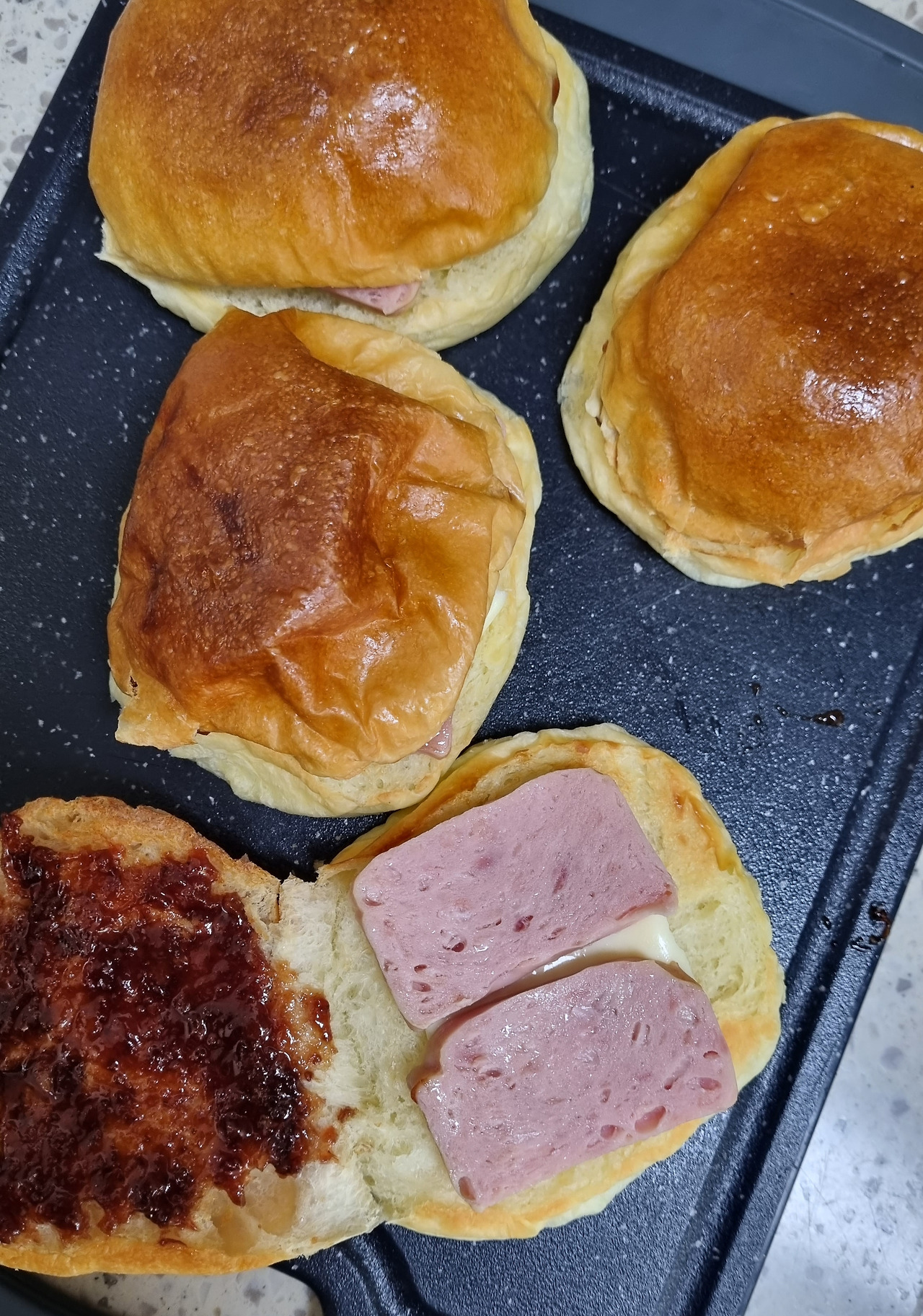 - 식빵을 살짝 구워 따뜻할 때 치즈를 얹고 그 위에 뜨거운 물에 데쳐낸 슬라이스 햄을 얹는다.